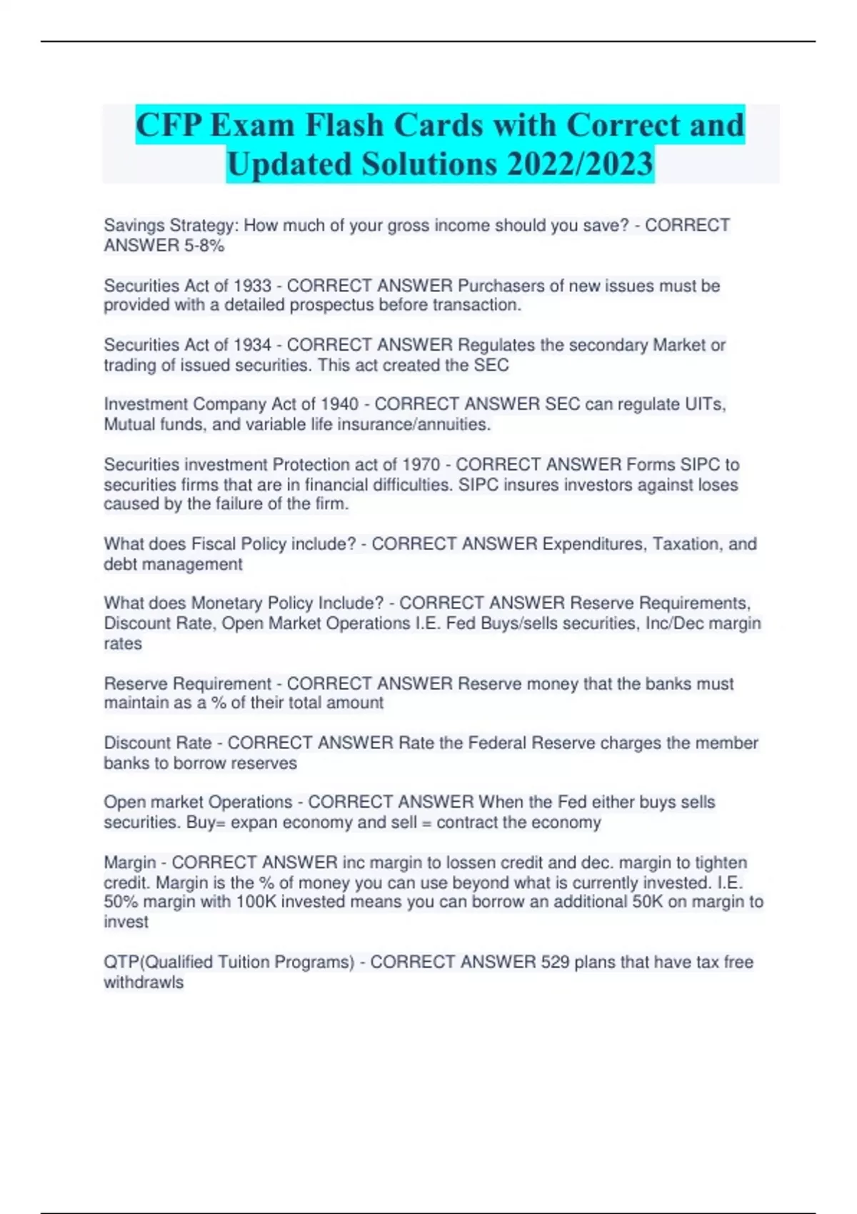 CFP Exam Flash Cards with Correct and Updated Solutions 2022/2023 Savings Strategy: How much of your gross income should you save? - CORRECT ANSWER 5-8% Securities Act of 1933 - CORRECT ANSWER Purchasers of new issues must be provided with a detailed prospectus before transaction. Securities Act of 1934 - CORRECT ANSWER Regulates the secondary Market or trading of issued securities. This act created the SEC Investment Company Act of 1940 - CORRECT ANSWER SEC can regulate UITs, Mutual funds, and variable life insurance/annuities. Securities investment Protection act of 1970 - CORRECT ANSWER Forms SIPC to securities firms that are in financial difficulties. SIPC insures investors against loses caused by the failure of the firm. What does Fiscal Policy include? - CORRECT ANSWER Expenditures, Taxation, and debt management What does Monetary Policy Include? - CORRECT ANSWER Reserve Requirements, Discount Rate, Open Market Operations I.E. Fed Buys/sells securities, Inc/Dec margin rates Reserve Requirement - CORRECT ANSWER Reserve money that the banks must maintain as a % of their total amount Discount Rate - CORRECT ANSWER Rate the Federal Reserve charges the member banks to borrow reserves Open market Operations - CORRECT ANSWER When the Fed either buys sells securities. Buy= expan economy and sell = contract the economy Margin - CORRECT ANSWER inc margin to lossen credit and dec. margin to tighten credit. Margin is the % of money you can use beyond what is currently invested. I.E. 50% margin with 100K invested means you can borrow an additional 50K on margin to invest QTP(Qualified Tuition Programs) - CORRECT ANSWER 529 plans that have tax free withdrawls