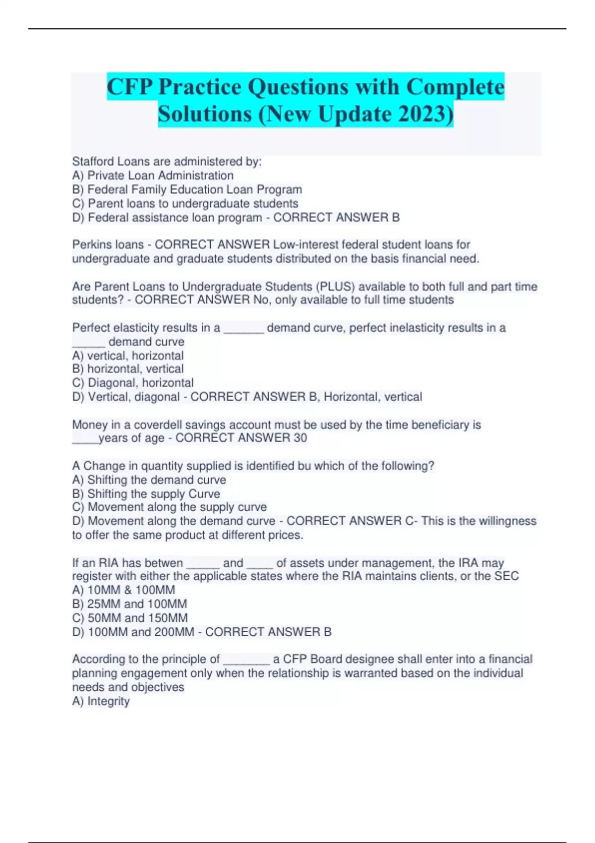 CFP Practice Questions with Complete Solutions (New Update 2023) Stafford Loans are administered by: A) Private Loan Administration B) Federal Family Education Loan Program C) Parent loans to undergraduate students D) Federal assistance loan program - CORRECT ANSWER B Perkins loans - CORRECT ANSWER Low-interest federal student loans for undergraduate and graduate students distributed on the basis financial need. Are Parent Loans to Undergraduate Students (PLUS) available to both full and part time students? - CORRECT ANSWER No, only available to full time students Perfect elasticity results in a ______ demand curve, perfect inelasticity results in a _____ demand curve A) vertical, horizontal B) horizontal, vertical C) Diagonal, horizontal D) Vertical, diagonal - CORRECT ANSWER B, Horizontal, vertical Money in a coverdell savings account must be used by the time beneficiary is ____years of age - CORRECT ANSWER 30 A Change in quantity supplied is identified bu which of the following? A) Shifting the demand curve B) Shifting the supply Curve C) Movement along the supply curve D) Movement along the demand curve - CORRECT ANSWER C- This is the willingness to offer the same product at different prices. If an RIA has betwen _____ and ____ of assets under management, the IRA may register with either the applicable states where the RIA maintains clients, or the SEC A) 10MM & 100MM B) 25MM and 100MM C) 50MM and 150MM D) 100MM and 200MM - CORRECT ANSWER B According to the principle of _______ a CFP Board designee shall enter into a financial planning engagement only when the relationship is warranted based on the individual needs and objectives A) Integrity B) Fairness C) Competence D) Diligence - CORRECT ANSWER D Which of the following are among the economic goals of the Federal Reserve and the US Treasury? 1) Full Employment 2) Stable Prices 3) Economic Growth 4) Decrease Governmental Spending A) 1 and 4 B) 3 and 4 C) 1, 2, and 3 D) All of the Above - CORRECT ANSWER C