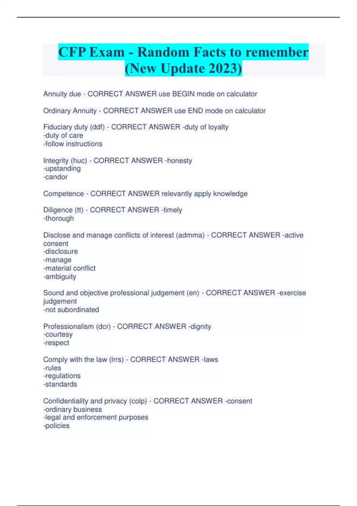 CFP Exam - Random Facts to remember (New Update 2023) Annuity due - CORRECT ANSWER use BEGIN mode on calculator Ordinary Annuity - CORRECT ANSWER use END mode on calculator Fiduciary duty (ddf) - CORRECT ANSWER -duty of loyalty -duty of care -follow instructions Integrity (huc) - CORRECT ANSWER -honesty -upstanding -candor Competence - CORRECT ANSWER relevantly apply knowledge Diligence (tt) - CORRECT ANSWER -timely -thorough Disclose and manage conflicts of interest (admma) - CORRECT ANSWER -active consent -disclosure -manage -material conflict -ambiguity Sound and objective professional judgement (en) - CORRECT ANSWER -exercise judgement -not subordinated Professionalism (dcr) - CORRECT ANSWER -dignity -courtesy -respect Comply with the law (lrrs) - CORRECT ANSWER -laws -rules -regulations -standards Confidentiality and privacy (colp) - CORRECT ANSWER -consent -ordinary business -legal and enforcement purposes -policies