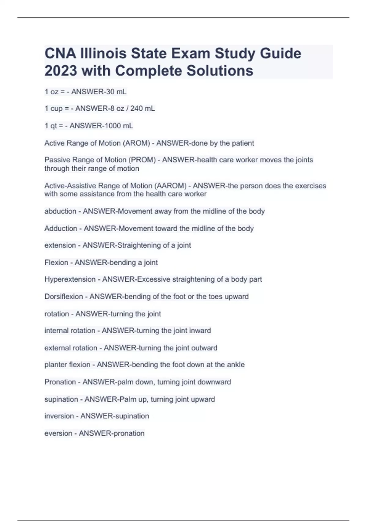 CNA Illinois State Exam Study Guide 2023 with Complete SolutionsCNA Illinois State Exam Study Guide 2023 with Complete SolutionsCNA Illinois State Exam Study Guide 2023 with Complete Solutions1 oz = - ANSWER-30 mL 1 cup = - ANSWER-8 oz / 240 mL 1 qt = - ANSWER-1000 mL Active Range of Motion (AROM) - ANSWER-done by the patient Passive Range of Motion (PROM) - ANSWER-health care worker moves the joints through their range of motion Active-Assistive Range of Motion (AAROM) - ANSWER-the person does the exercises with some assistance from the health care worker abduction - ANSWER-Movement away from the midline of the body Adduction - ANSWER-Movement toward the midline of the body