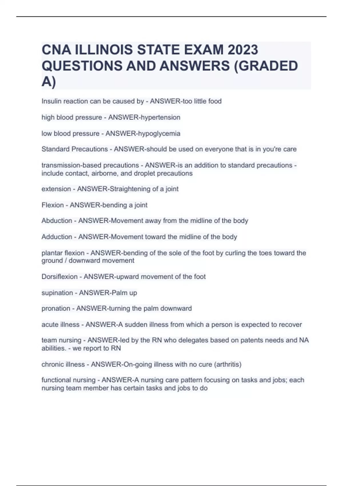 CNA ILLINOIS STATE EXAM 2023 QUESTIONS AND ANSWERS (GRADED A)CNA ILLINOIS STATE EXAM 2023 QUESTIONS AND ANSWERS (GRADED A)CNA ILLINOIS STATE EXAM 2023 QUESTIONS AND ANSWERS (GRADED A)Insulin reaction can be caused by - ANSWER-too little food high blood pressure - ANSWER-hypertension low blood pressure - ANSWER-hypoglycemia Standard Precautions - ANSWER-should be used on everyone that is in you're care transmission-based precautions - ANSWER-is an addition to standard precautions - include contact, airborne, and droplet precautions extension - ANSWER-Straightening of a joint Flexion - ANSWER-bending a joint Abduction - ANSWER-Movement away from the midline of the body Adduction - ANSWER-Movement toward the midline of the body plantar flexion - ANSWER-bending of the sole of the foot by curling the toes toward the ground / downward movement