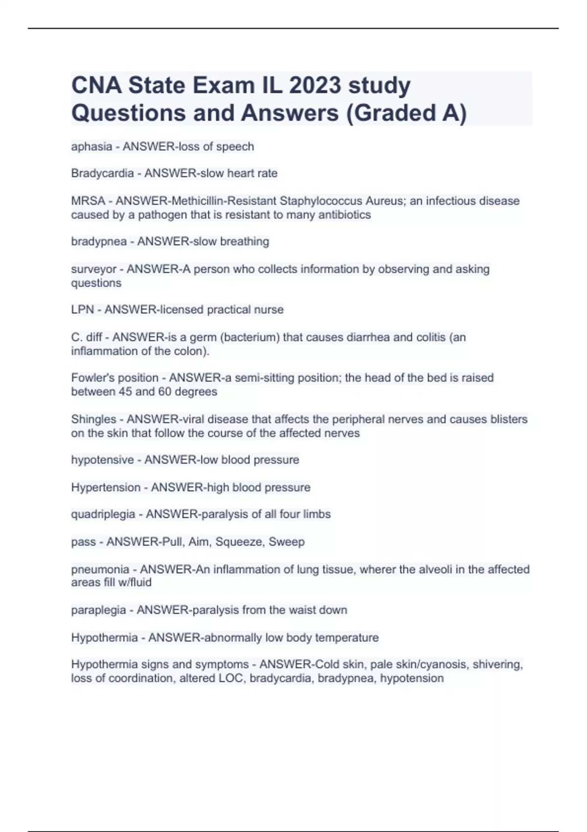CNA State Exam IL 2023 study Questions and Answers (Graded A)CNA State Exam IL 2023 study Questions and Answers (Graded A) aphasia - ANSWER-loss of speech Bradycardia - ANSWER-slow heart rate MRSA - ANSWER-Methicillin-Resistant Staphylococcus Aureus; an infectious disease caused by a pathogen that is resistant to many antibiotics bradypnea - ANSWER-slow breathing surveyor - ANSWER-A person who collects information by observing and asking questions LPN - ANSWER-licensed practical nurse C. diff - ANSWER-is a germ (bacterium) that causes diarrhea and colitis (an inflammation of the colon). Fowler's position - ANSWER-a semi-sitting position; the head of the bed is raised between 45 and 60 degrees Shingles - ANSWER-viral disease that affects the peripheral nerves and causes blisters on the skin that follow the course of the affected nerves