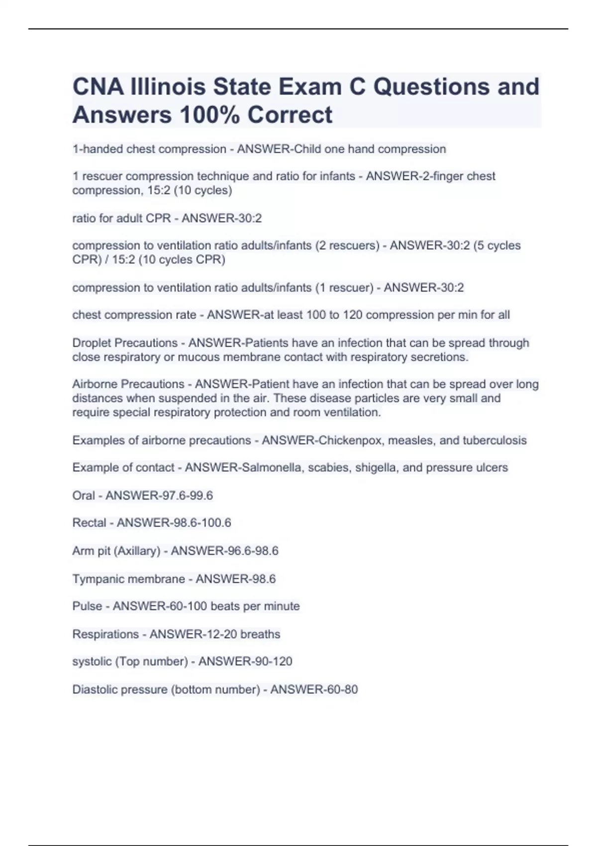 CNA Illinois State Exam C Questions and Answers 100% Correct CNA Illinois State Exam C Questions and Answers 100% Correct CNA Illinois State Exam C Questions and Answers 100% Correct 1-handed chest compression - ANSWER-Child one hand compression 1 rescuer compression technique and ratio for infants - ANSWER-2-finger chest compression, 15:2 (10 cycles) ratio for adult CPR - ANSWER-30:2 compression to ventilation ratio adults/infants (2 rescuers) - ANSWER-30:2 (5 cycles CPR) / 15:2 (10 cycles CPR) compression to ventilation ratio adults/infants (1 rescuer) - ANSWER-30:2 chest compression rate - ANSWER-at least 100 to 120 compression per min for all