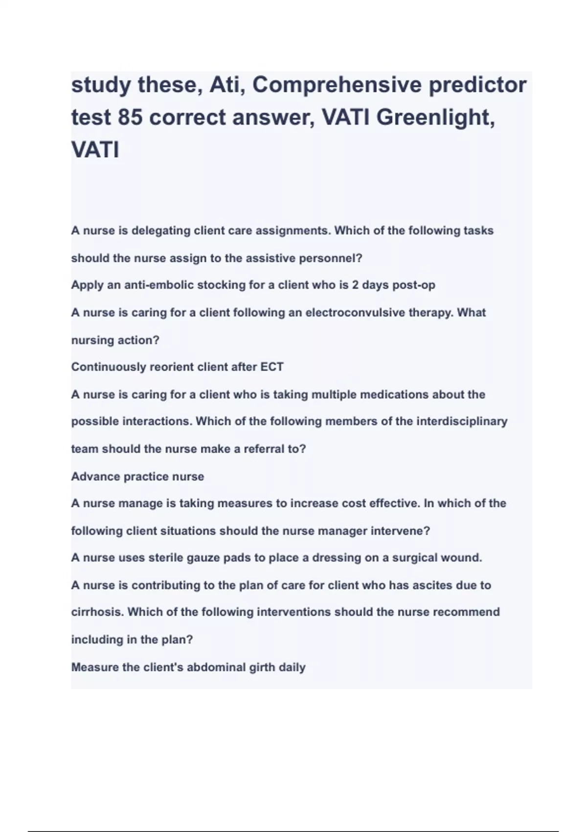 study these, Ati, Comprehensive predictor test 85 correct answer, VATI Greenlight, VATI 2023 ( A+ GRADED 100% VERIFIED)