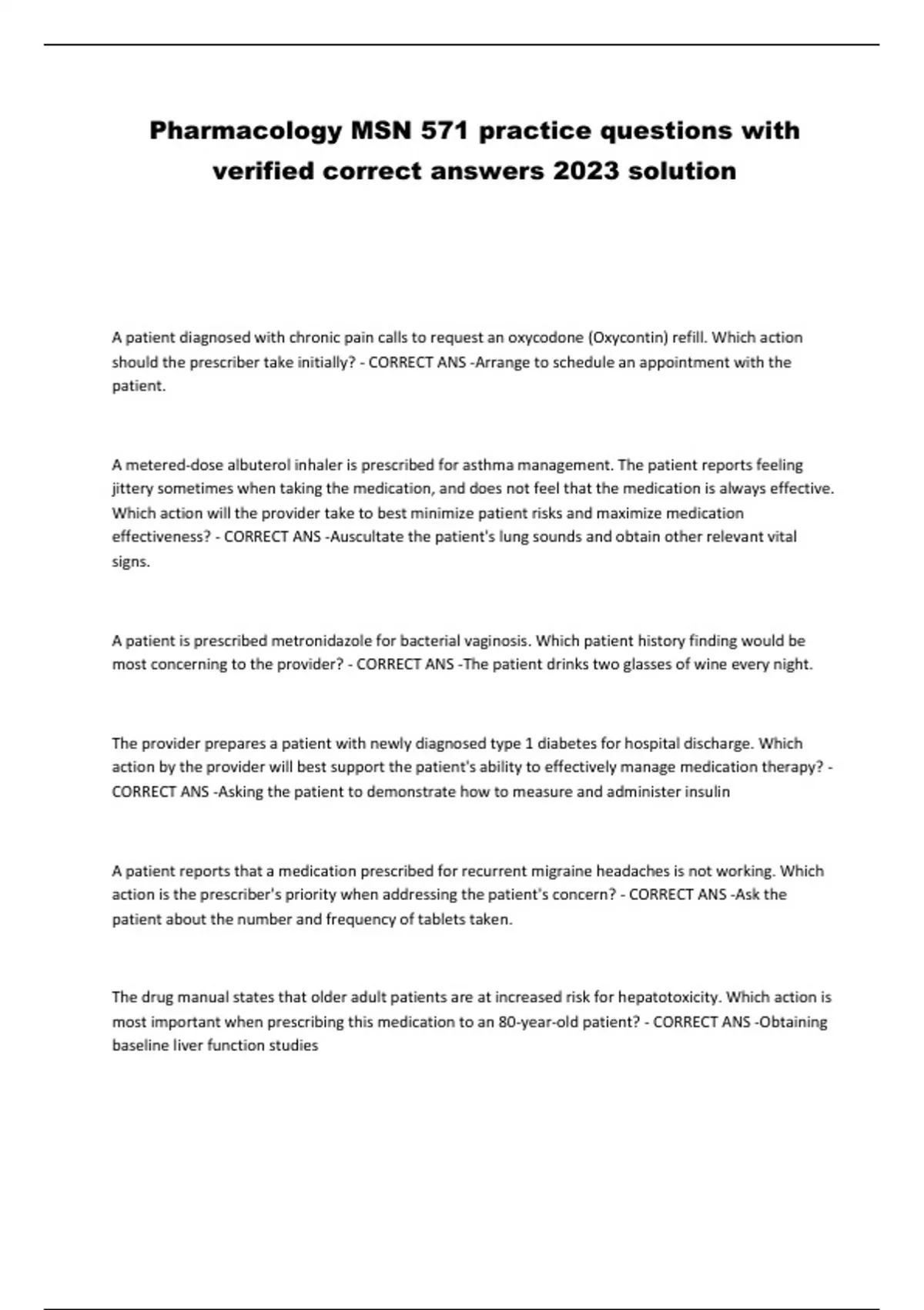 Pharmacology MSN 571 practice questions with verified correct answers 2023 solution A patient diagnosed with chronic pain calls to request an oxycodone (Oxycontin) refill. Which action should the prescriber take initially? - CORRECT ANS -Arrange to schedule an appointment with the patient. A metered-dose albuterol inhaler is prescribed for asthma management. The patient reports feeling jittery sometimes when taking the medication, and does not feel that the medication is always effective. Which action will the provider take to best minimize patient risks and maximize medication effectiveness? - CORRECT ANS -Auscultate the patient's lung sounds and obtain other relevant vital signs. A patient is prescribed metronidazole for bacterial vaginosis. Which patient history finding would be most concerning to the provider? - CORRECT ANS -The patient drinks two glasses of wine every night. The provider prepares a patient with newly diagnosed type 1 diabetes for hospital discharge. Which action by the provider will best support the patient's ability to effectively manage medication therapy? - CORRECT ANS -Asking the patient to demonstrate how to measure and administer insulin
