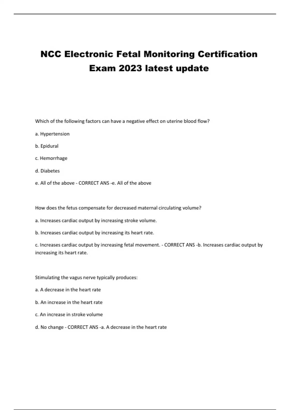 NCC Electronic Fetal Monitoring Certification Exam 2023 latest update Which of the following factors can have a negative effect on uterine blood flow? a. Hypertension b. Epidural c. Hemorrhage d. Diabetes e. All of the above - CORRECT ANS -e. All of the above How does the fetus compensate for decreased maternal circulating volume? a. Increases cardiac output by increasing stroke volume. b. Increases cardiac output by increasing its heart rate. c. Increases cardiac output by increasing fetal movement. - CORRECT ANS -b. Increases cardiac output by increasing its heart rate. Stimulating the vagus nerve typically produces: a. A decrease in the heart rate b. An increase in the heart rate c. An increase in stroke volume d. No change - CORRECT ANS -a. A decrease in the heart rate