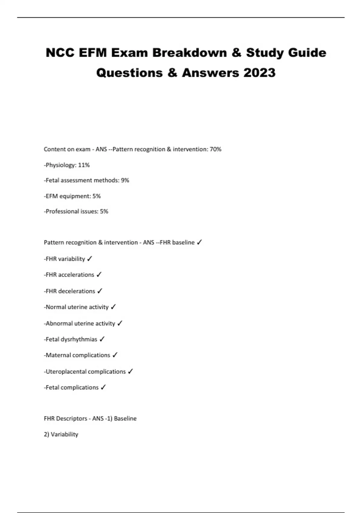 NCC EFM Exam Breakdown & Study Guide Questions & Answers 2023 Content on exam - ANS --Pattern recognition & intervention: 70% -Physiology: 11% -Fetal assessment methods: 9% -EFM equipment: 5% -Professional issues: 5% Pattern recognition & intervention - ANS --FHR baseline -FHR variability -FHR accelerations -FHR decelerations -Normal uterine activity -Abnormal uterine activity -Fetal dysrhythmias -Maternal complications -Uteroplacental complications -Fetal complications