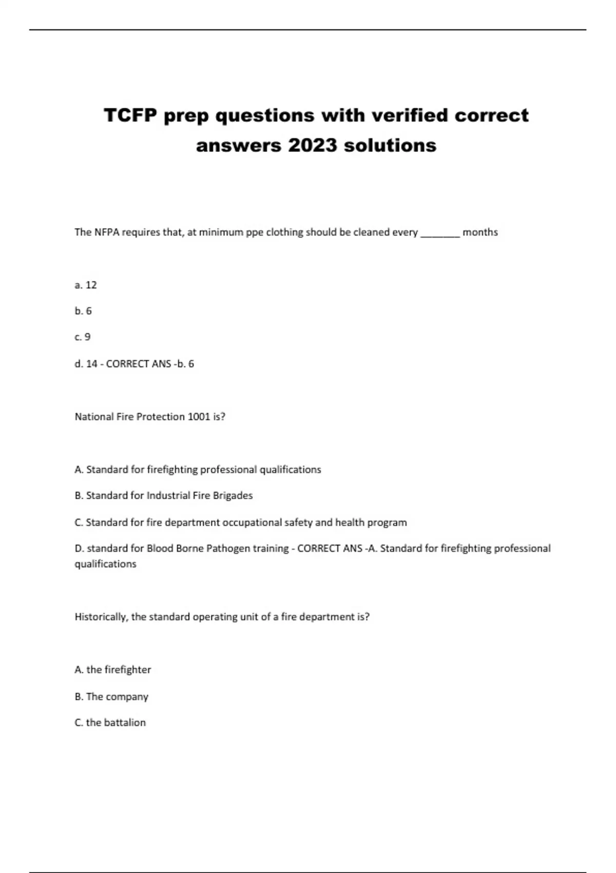 TCFP prep questions with verified correct answers 2023 solutions The NFPA requires that, at minimum ppe clothing should be cleaned every _______ months a. 12 b. 6 c. 9 d. 14 - CORRECT ANS -b. 6 National Fire Protection 1001 is? A. Standard for firefighting professional qualifications B. Standard for Industrial Fire Brigades C. Standard for fire department occupational safety and health program D. standard for Blood Borne Pathogen training - CORRECT ANS -A. Standard for firefighting professional qualifications Historically, the standard operating unit of a fire department is? A. the firefighter B. The company C. the battalion D. a platoon/shift - CORRECT ANS -B. The company