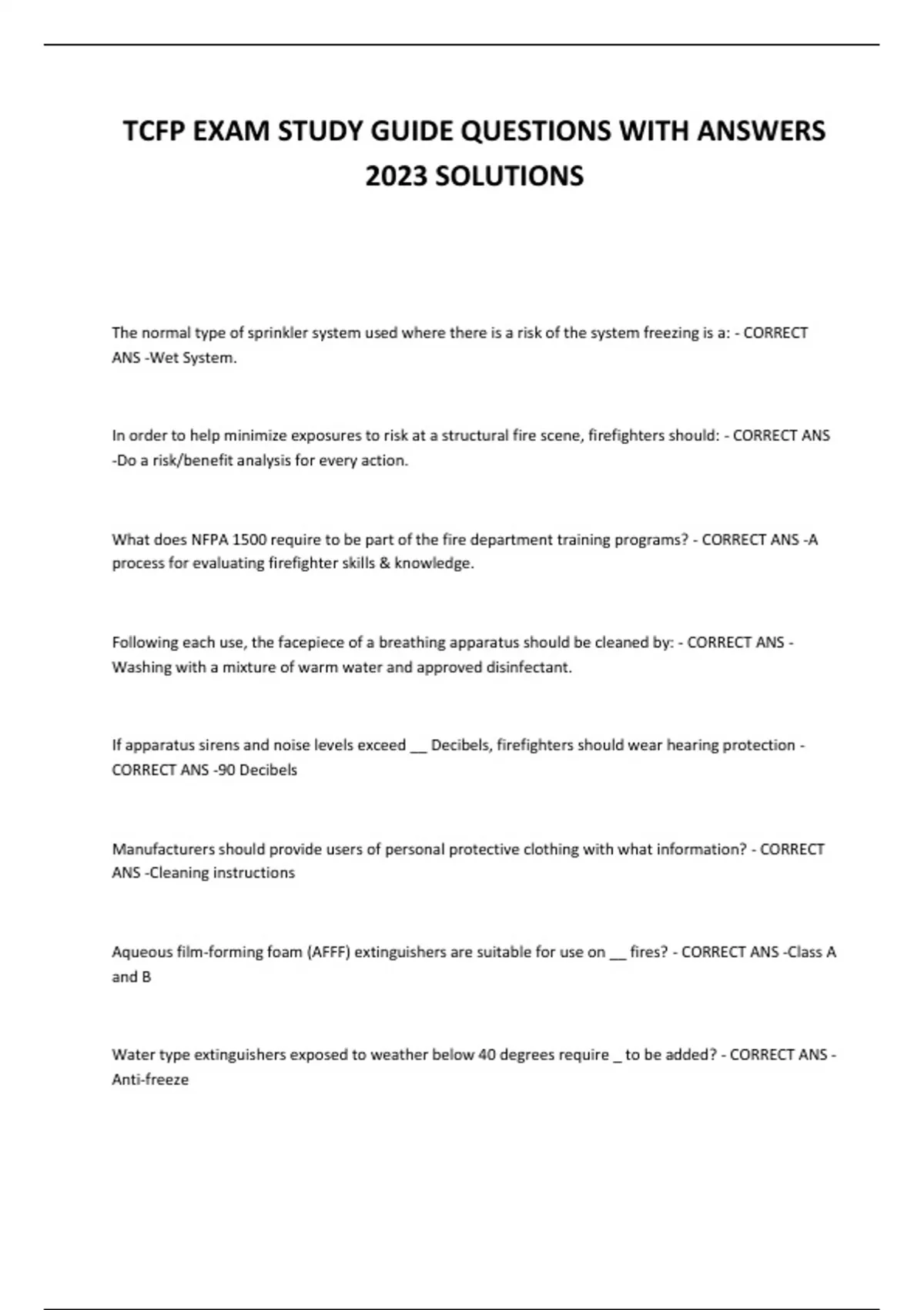 TCFP EXAM STUDY GUIDE QUESTIONS WITH ANSWERS 2023 SOLUTIONS The normal type of sprinkler system used where there is a risk of the system freezing is a: - CORRECT ANS -Wet System. In order to help minimize exposures to risk at a structural fire scene, firefighters should: - CORRECT ANS -Do a risk/benefit analysis for every action. What does NFPA 1500 require to be part of the fire department training programs? - CORRECT ANS -A process for evaluating firefighter skills & knowledge. Following each use, the facepiece of a breathing apparatus should be cleaned by: - CORRECT ANS -Washing with a mixture of warm water and approved disinfectant. If apparatus sirens and noise levels exceed __ Decibels, firefighters should wear hearing protection - CORRECT ANS -90 Decibels Manufacturers should provide users of personal protective clothing with what information? - CORRECT ANS -Cleaning instructions Aqueous film-forming foam (AFFF) extinguishers are suitable for use on __ fires? - CORRECT ANS -Class A and B