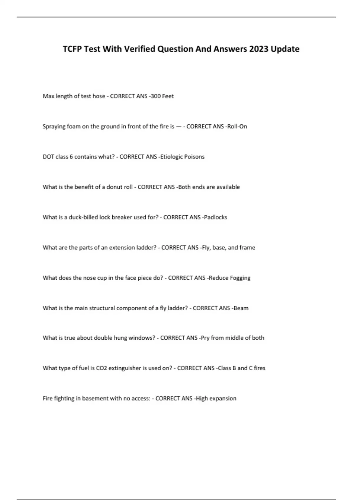 TCFP Test With Verified Question And Answers 2023 Update Max length of test hose - CORRECT ANS -300 Feet Spraying foam on the ground in front of the fire is — - CORRECT ANS -Roll-On DOT class 6 contains what? - CORRECT ANS -Etiologic Poisons What is the benefit of a donut roll - CORRECT ANS -Both ends are available What is a duck-billed lock breaker used for? - CORRECT ANS -Padlocks What are the parts of an extension ladder? - CORRECT ANS -Fly, base, and frame