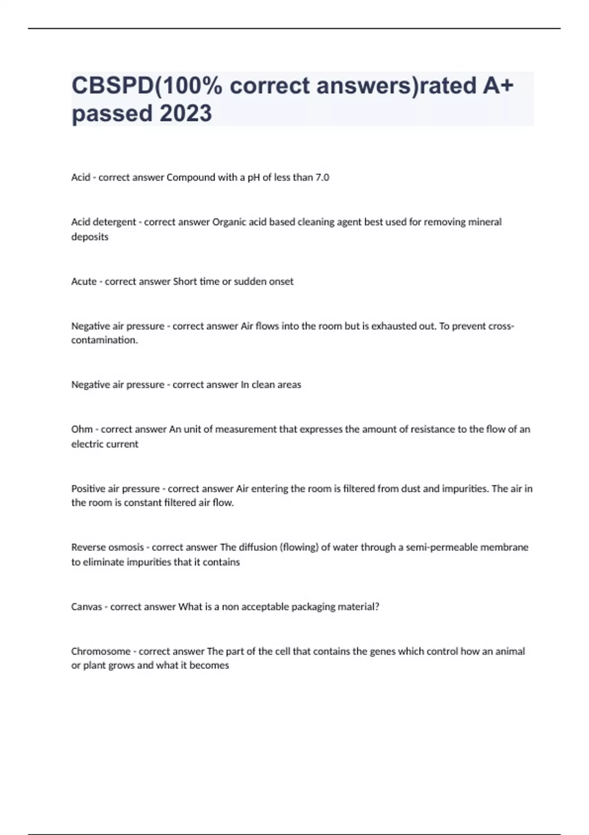 CBSPD(100% correct answers)rated A+ passed 2023Acid - correct answer Compound with a pH of less than 7.0 Acid detergent - correct answer Organic acid based cleaning agent best used for removing mineral deposits Acute - correct answer Short time or sudden onset Negative air pressure - correct answer Air flows into the room but is exhausted out. To prevent cross-contamination. Negative air pressure - correct answer In clean areas Ohm - correct answer An unit of measurement that expresses the amount of resistance to the flow of an electric current Positive air pressure - correct answer Air entering the room is filtered from dust and impurities. The air in the room is constant filtered air flow. Reverse osmosis - correct answer The diffusion (flowing) of water through a semi-permeable membrane to eliminate impurities that it contains Canvas - correct answer What is a non acceptable packaging material? Chromosome - correct answer The part of the cell that contains the genes which control how an animal or plant grows and what it becomes