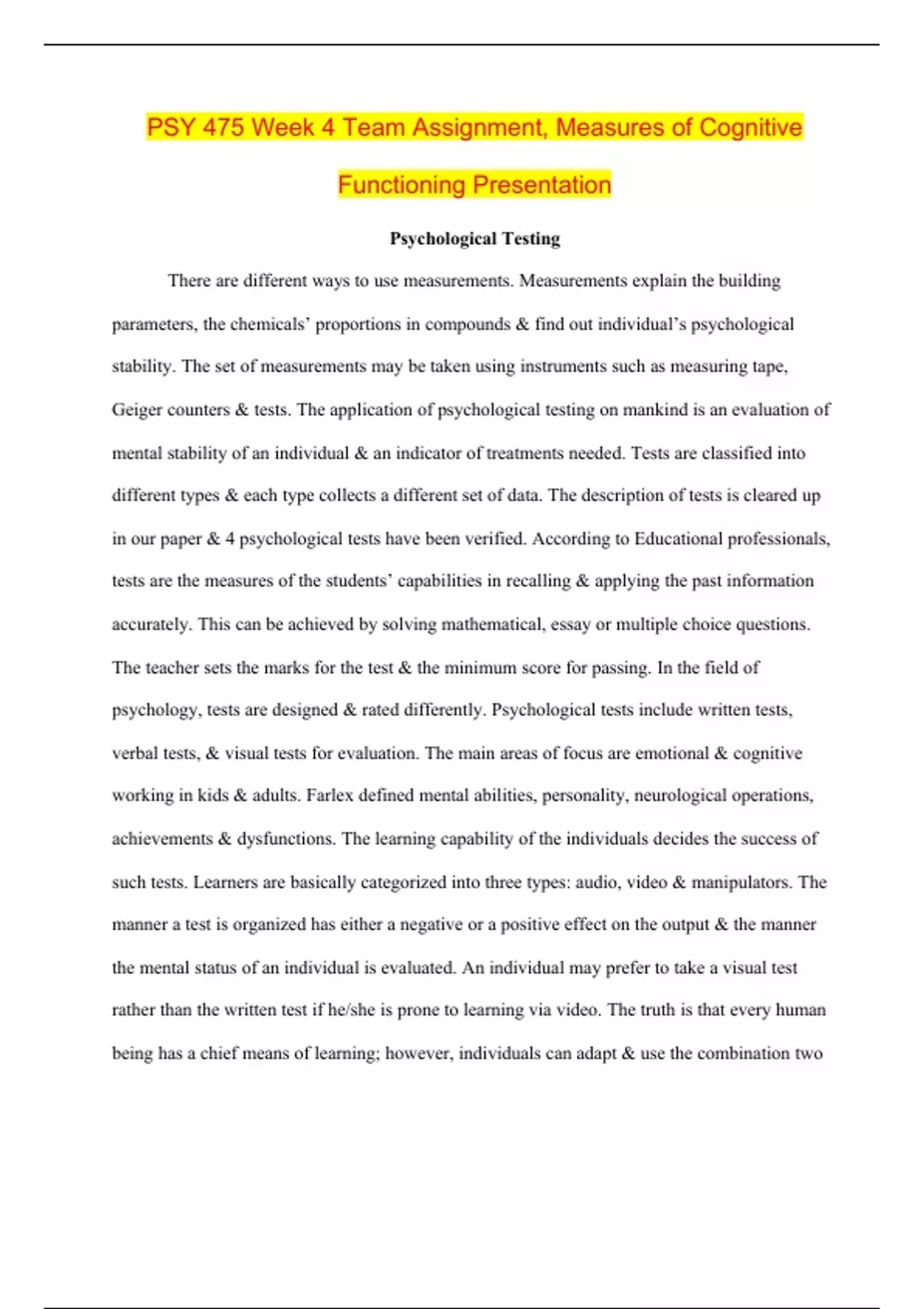 PSY 475 Week 4 Team Assignment, Measures of Cognitive Functioning Presentation