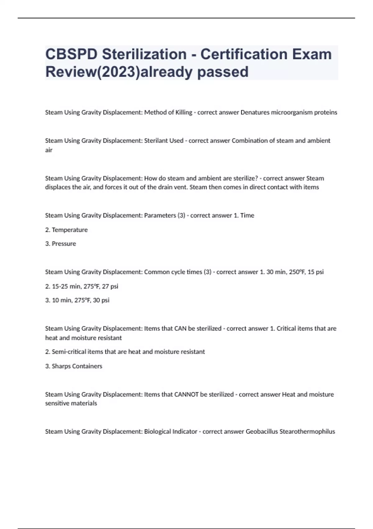 CBSPD Sterilization - Certification Exam Review(2023)already passed Steam Using Gravity Displacement: Method of Killing - correct answer Denatures microorganism proteins Steam Using Gravity Displacement: Sterilant Used - correct answer Combination of steam and ambient air Steam Using Gravity Displacement: How do steam and ambient are sterilize? - correct answer Steam displaces the air, and forces it out of the drain vent. Steam then comes in direct contact with items Steam Using Gravity Displacement: Parameters (3) - correct answer 1. Time 2. Temperature 3. Pressure Steam Using Gravity Displacement: Common cycle times (3) - correct answer 1. 30 min, 250°F, 15 psi 2. 15-25 min, 275°F, 27 psi 3. 10 min, 275°F, 30 psi Steam Using Gravity Displacement: Items that CAN be sterilized - correct answer 1. Critical items that are heat and moisture resistant 2. Semi-critical items that are heat and moisture resistant 3. Sharps Containers Steam Using Gravity Displacement: Items that CANNOT be sterilized - correct answer Heat and moisture sensitive materials Steam Using Gravity Displacement: Biological Indicator - correct answer Geobacillus Stearothermophilus Steam Using Dynamic Air Removal: Method of Killing - correct answer Denatures microorganism proteins Steam Using Dynamic Air Removal: Sterilants Used (3) - correct answer 1. Combination of steam and ambient air 2. Prevacuum Sterilizers 3. (SFPP) Steam-flush pressure-pulse sterilizers Steam Using Dynamic Air Removal: Parameters (3) - correct answer 1. Time 2. Temperature 3. Pressure Steam Using Dynamic Air Removal: Common Cycle Times (2) - correct answer 1. 4 min, 270°F, 28-30 psi 2. 3 min, 275°F, 28-30 psi Steam Using Dynamic Air Removal: Items that CAN be sterilized - correct answer 1. Critical items that are heat and moisture resistant 2. Semi-critical items that are heat and moisture resistant 3. Sharps Containers Steam Using Dynamic Air Removal: Items that CANNOT be sterilized - correct answer Heat and moisture sensitive items Steam Using Dynamic Air Removal: Biological Indicator - correct answer Geobacillus Stearothermophilus EO: Method of Killing - correct answer Alkylation: interferes with microorganism metabolism EO: Sterilants Used (2) - correct answer 1. 100% EO (undiluted) - common 2. EO Mixtures (contains HCFC and CO2) - uncommon EO: Parameters (5) - correct answer 1. Time
