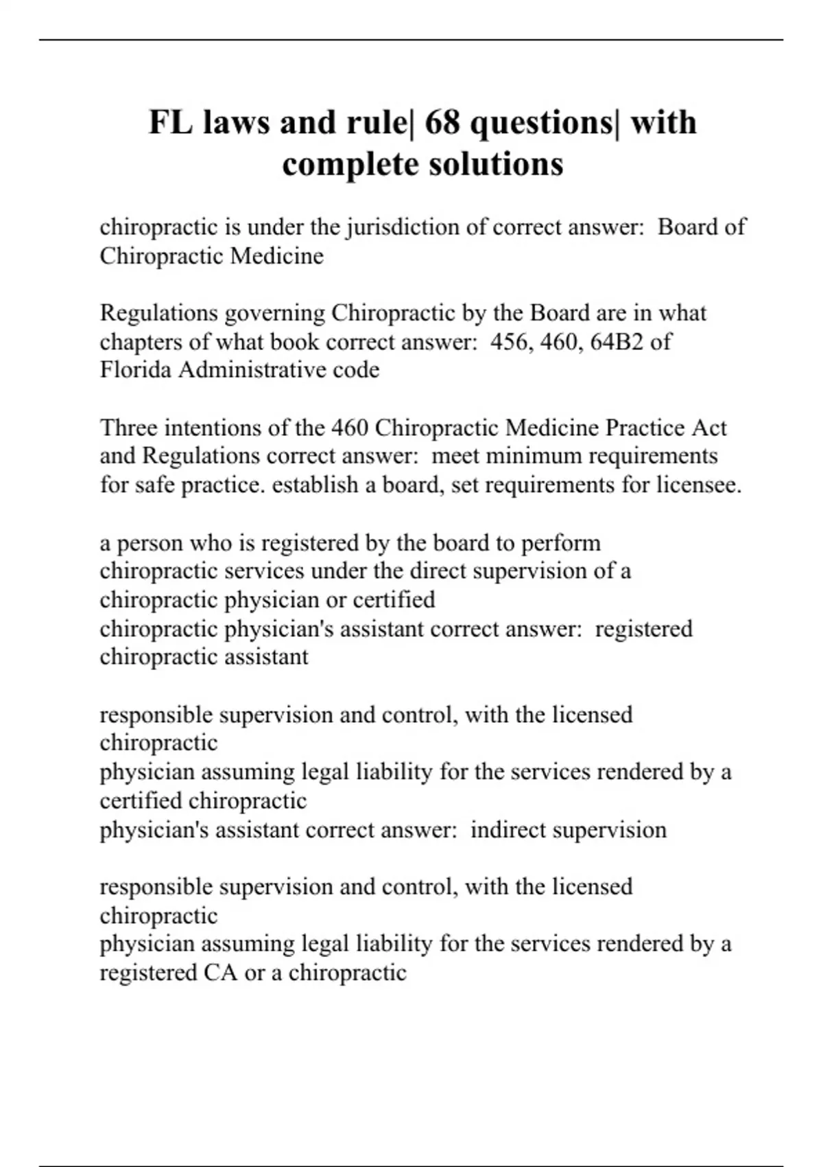 chiropractic is under the jurisdiction of correct answer: Board of Chiropractic Medicine Regulations governing Chiropractic by the Board are in what chapters of what book correct answer: 456, 460, 64B2 of Florida Administrative code Three intentions of the 460 Chiropractic Medicine Practice Act and Regulations correct answer: meet minimum requirements for safe practice. establish a board, set requirements for licensee. a person who is registered by the board to perform chiropractic services under the direct supervision of a chiropractic physician or certified chiropractic physician's assistant correct answer: registered chiropractic assistant responsible supervision and control, with the licensed chiropractic physician assuming legal liability for the services rendered by a certified chiropractic physician's assistant correct answer: indirect supervision responsible supervision and control, with the licen