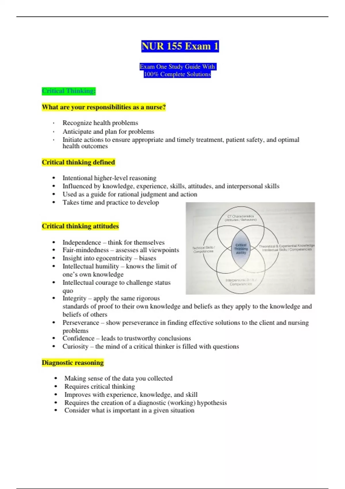NUR 155 Exam 1 2023 Full and Revised Study Guide. Exam One Study Guide Critical Thinking: What are your responsibilities as a nurse? Recognize health problems Anticipate and plan for problems Initiate actions to ensure appropriate and timely treatment, patient safety, and optimal health outcomes Critical thinking defined Intentional higher-level reasoning Influenced by knowledge, experience, skills, attitudes, and interpersonal skills Used as a guide for rational judgment and action Takes time and practice to develop Critical thinking attitudes Independence – think for themselves Fair-mindedness – assesses all viewpoints Insight into egocentricity – biases Intellectual humility – knows the limit of one’s own knowledge Intellectual courage to challenge status quo Integrity – apply the same rigorous standards of proof to their own knowledge and beliefs as they apply to the knowledge and beliefs of others Perseverance – show perseverance in finding effective solutions to the client and nursing problems Confidence – leads to trustworthy conclusions Curiosity – the mind of a critical thinker is filled with questions Diagnostic reasoning Making sense of the data you collected Requires critical thinking Improves with experience, knowledge, and skill Requires the creation of a diagnostic (working) hypothesis Consider what is important in a given situation 1 Four components of diagnostic reasoning Cues (ex. Pt staggers into ER) Diagnostic “working” hypothesis (ex. Pt is intoxicated) Data collection to support hypothesis (ex. No alcohol on breath, clammy skin, diaphoretic, disoriented, blood glucose level is critical at 61) Evaluating hypothesis (ex. Pt isn’t intoxicated, pt is hypoglycemic and requires immediate intervention to prevent life-threatening complications) Critical thinking techniques Critical Thinking – is the process of intentional higher-level thinking to define a pts problem, examine the evidence-based practice in caring for the pt, and make choices in the delivery of care Critical Reasoning – is the cognitive process that uses thinking strategies to gather and analyze pt information, evaluate the relevance of the information, and decide on possible nursing actions to improve the pts physiological and psychosocial outcomes Critical Analysis – is the application of a set of questions to a particular situation or idea to determine essential information and ideas and discard unimportant information and ideas Socratic Questioning – is a technique one can use to look beneath the surface, recognize and examine assumptions, search for inconsistencies, examine multiple points of view, and differentiate what one knows from what one merely believes Inductive Reasoning – generalizations are formed from a set of facts or observations Deductive Reasoning – is reasoning from general premise to the specific conclusion Nursing Process – is a systematic, rational method of planning and providing individualized nursing care. It begins with assessment of the pt and use of clinical reasoning to identify pt problems. Clinical Judgment – is a decision-making process to ascertain the right nursing action to be implemented at the appropriate time in the pt’s care Cognitive Processes – are the thinking processes based on the knowledge of aspects of client care, cognitive skills are learned through reading and applying health-related literature Metacognitive Processes – include reflective thinking and awareness of the skills learned by the nurse in caring for the pt, the nurse reflects on the pt’s status, and through the use of critical thinking skills determines the most effective plan of care 2 Problem solving techniques Trial & Error – in which a number of approaches are tried until a solution is found (least effective, pt could suffer harm) Intuition – is a problem-solving approach that relies on a nurse’s inner sense, 6th sense, hunch, instinct, feeling, or suspicion (experience improves intuition) Research process – evidence-based decisions and care, what do we know works best vs what we’ve always done (pursue answers to pt care problems through research) Concept mapping Concept maps provide an opportunity to “see” thinking The map maker’s prior knowledge influences what is portrayed on the concept map Something to think about Nurses are responsible for a unique dimension of healthcare – “the diagnosis and treatment of human responses to actual or potential health problems” Nurses use knowledge from other disciplines Nurses deal with change in stressful environments Nurses make important decisions Nursing process Is a systematic, rational method of planning and providing individualized nursing care Its purposes are to identify a pt’s health status and actual or potential health care problems or needs, to establish plans to meet identified needs, and to deliver specific nursing interventions to meet those needs The pt may be an individual, a family, a community, or a group The nursing process is… 3 Systematic – the nursing process has an ordered sequence of activities and each activity depends on the accuracy of the activity that precedes it and influences the activity following it Dynamic – the nursing process has great interaction and overlapping among the activities and each activity is fluid and flows into the next activity Client Centered – the nursing process ensures that nurses are client-centered rather than taskcentered Goal-Directed – the nursing process is a means for nurses and clients to work together to identify specific goals and to match them with the appropriate nursing actions Universally applicable – the nursing process allows nurses to practice nursing with well or ill people, young or old, in any type of practice setting ADPIE A – assessment D – diagnosis P – planning I – implementation E – evaluation Assessment Collect data Organize data Validate data Document data Diagnosis Analyze data 