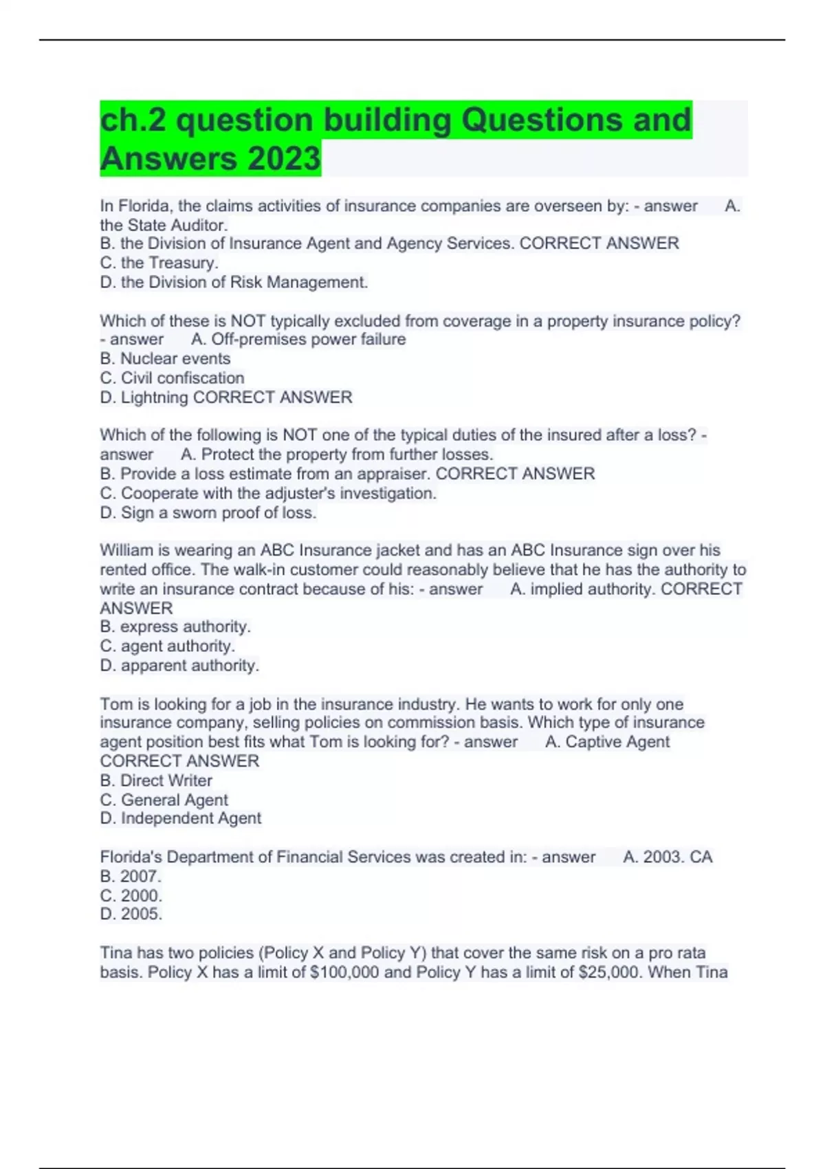 ch.2 question building Questions and Answers 2023 In Florida, the claims activities of insurance companies are overseen by: A. the State Auditor. B. the Division of Insurance Agent and Agency Services. CORRECT ANSWER C. the Treasury. D. the Division of Risk Management. Which of these is NOT typically excluded from coverage in a property insurance policy? A. Off-premises power failure B. Nuclear events C. Civil confiscation D. Lightning CORRECT ANSWER Which of the following is NOT one of the typical duties of the insured after a loss? A. Protect the property from further losses. B. Provide a loss estimate from an appraiser. CORRECT ANSWER C. Cooperate with the adjuster's investigation. D. Sign a sworn proof of loss. William is wearing an ABC Insurance jacket and has an ABC Insurance sign over his rented office. The walk-in customer could reasonably believe that he has the authority to write an insurance contract because of his: A. implied authority. CORRECT ANSWER B. express authority. C. agent authority. D. apparent authority. Tom is looking for a job in the insurance industry. He wants to work for only one insurance company, selling policies on commission basis. Which type of insurance agent position best fits what Tom is looking for? A. Captive Agent CORRECT ANSWER B. Direct Writer C. General Agent D. Independent Agent Florida's Department of Financial Services was created in: A. 2003. CA B. 2007. C. 2000. D. 2005. Tina has two policies (Policy X and Policy Y) that cover the same risk on a pro rata basis. Policy X has a limit of $100,000 and Policy Y has a limit of $25,000. When Tina suffers a loss totaling $75,000, how will the two policies respond A. Policy X will pay $50,000 and Policy Y will pay $25,000 B. Policy X will pay $37,500 and Policy Y will pay $25,000 C. Policy X will pay $75,000 and Policy Y will pay nothing D. Policy X will pay $60,000 and Policy Y will pay $15,000 CORRECT ANSWER This agent works for only one insurer and is paid commission. A. Exclusive Agent CORRECT Answer B. Independent Adjuster C. General Agent D. Independent Agent This agent works for only one insurer, and supervises and trains other agents. A. Exclusive Agent B. Captive Agent C. Direct Writer D. General Agent CORRECT ANSWER If an applicant for the Customer Representative license already has six months of full-time experience at an insurance company: A. they can skip the pre-licensing course and just pass the exam. CORRECT ANSWER B. they don't need to take a pre-licensing course or take the exam. C. they just need a professional reference from an agent they worked with. D. they just have to take the pre-licensing course and pass the exam. Ted gets into an argument with his neighbor over parking arrangements. In a fit of anger, Ted goes over to his neighbor's home and scratches up her car with a key, causing $2,000 in damages. The next day, Ted realizes his poor behavior and files a claim with his insurer for his liability in the damages to his neighbor's car. Why might Ted's insurer deny his claim? A. Ted's vandalism was intentional, and therefore excluded under his policy. CORECT ANSWER B. Ted's neighbor will have to file a claim with her own insurer. C. Insurance policies do not cover vandalism. D. Ted's neighbor was partially responsible for the damage, and thus will pay a pro rata portion of the loss. After her business suffered damage in a fire, Jane filed a claim with Acme Insurance, which dispatched Bob to adjust it, even though he was not allowed to adjust commercial claims. He investigated Jane's losses and submitted his estimate to Acme Insurance, which issued her a settlement check based on that estimate. Bob had _______ because Acme Insurance accepted his estimate and paid Jane's claim. A. expert authority B. apparent authority CORRECT ANSWER C. agency authority D. express authority The Severability of Interests condition states that: A. coverage applies to each insured separately, as if no other insured existed. CORRECT ANSWER B. when an insurer pays a total loss settlement, policy coverage may terminate and any unearned premiums will be refunded to the insured. C. an insurer has the right to cancel an insurance policy at any time. D. an insured has the right to cancel an insurance policy at any time. A Customer Representative does all of the following EXCEPT: A. serve customers. B. office management. C. represent the agent or agency. D. adjust small claims. CORRECT ANSWER