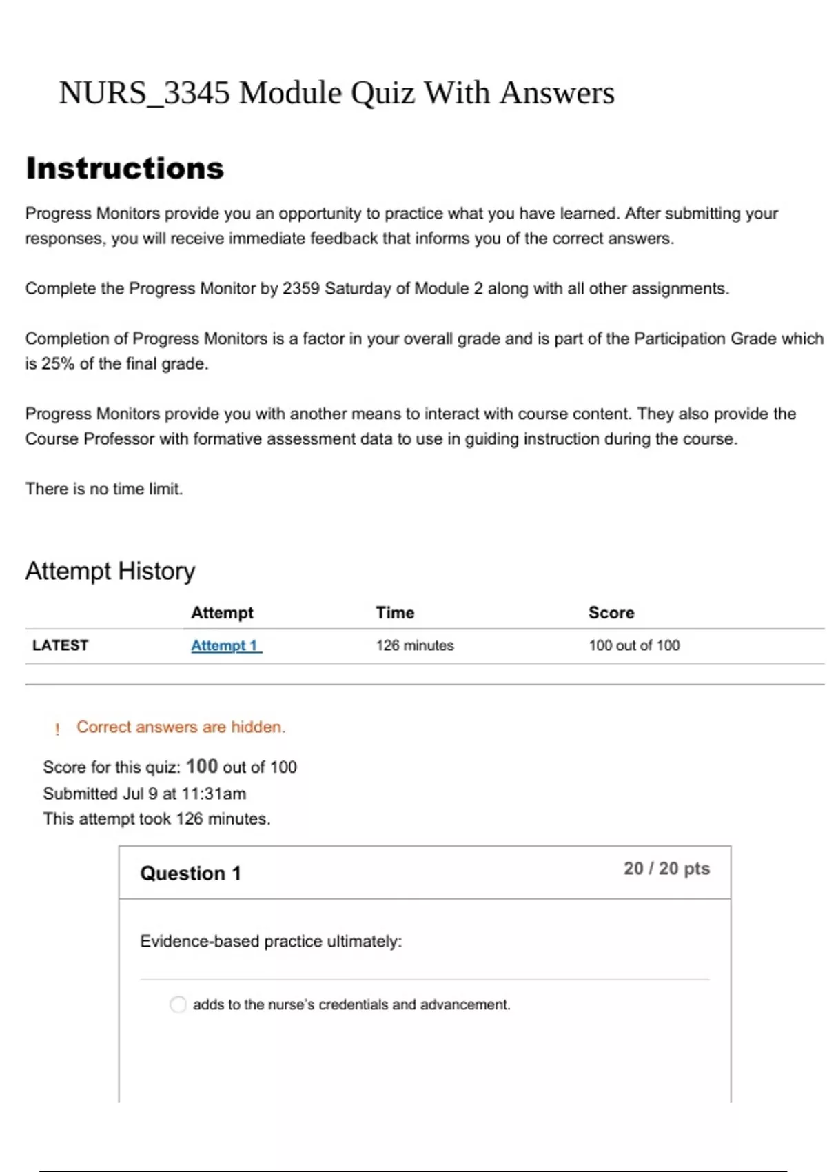 NURS_3345 Module Quiz With Answers. Question 1 20 / 20 pts Evidence-based practice ultimately: adds to the nurse’s credentials and advancement. impresses patients and their families with big words. improves patient outcomes and adds to nursing knowledge. adds to nursing knowledge and credentials. The collection of data in order to make better informed decisions about patient care and to improve policies and procedures related to patient care improves patient outcomes and adds to and validates nursing knowledge. Question 2 20 / 20 pts Nursing theory provides: concepts and challenges. common language and a decision-making framework. a conceptual framework for study. an application triad for study. Theory provides a common way of speaking about something with a defined framework for decision making. Question 3 20 / 20 pts In ANA’s Code of Ethics, autonomy refers to: telling the truth. doing no harm. acting on one’s own. trusting. Autonomy is related to the actions of the individual. Question 4 20 / 20 pts Identify the correct citation of an author within the body of an article or within a paper at the end of a sentence.
