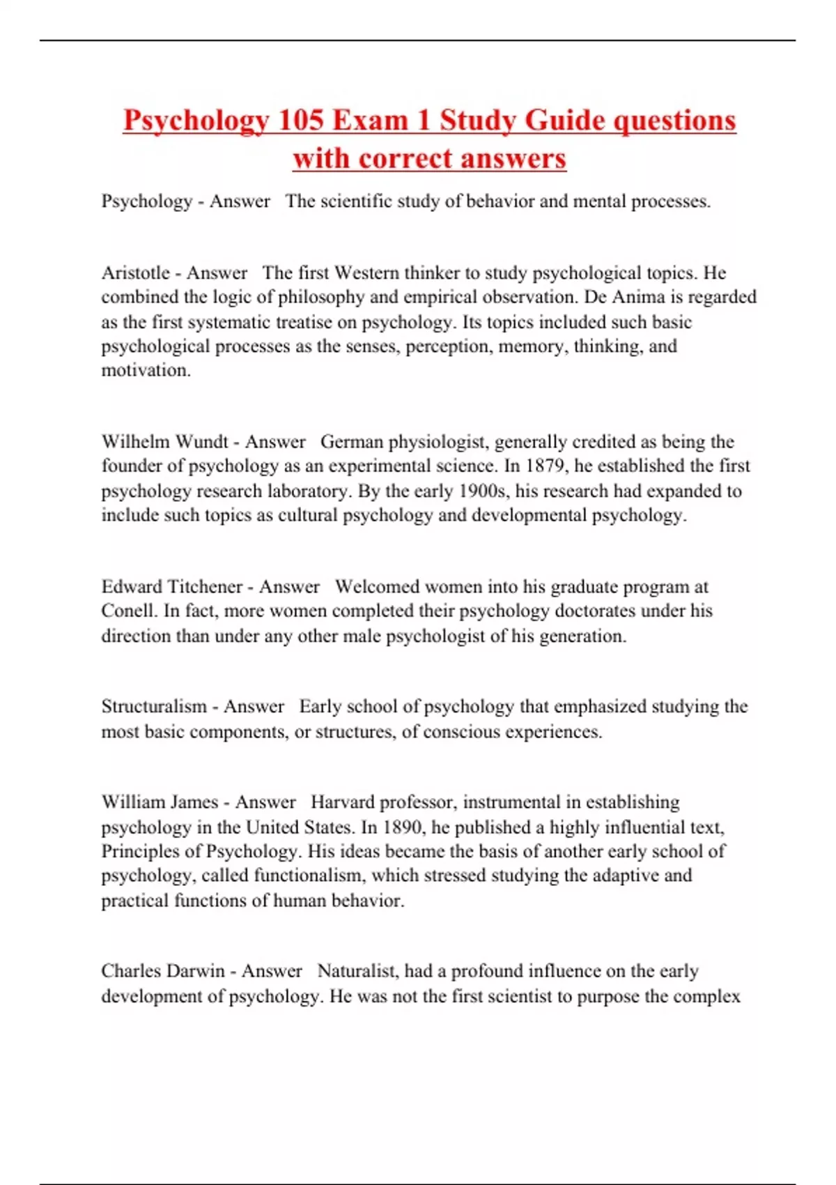 Psychology - Answer The scientific study of behavior and mental processes. Aristotle - Answer The first Western thinker to study psychological topics. He combined the logic of philosophy and empirical observation. De Anima is regarded as the first systematic treatise on psychology. Its topics included such basic psychological processes as the senses, perception, memory, thinking, and motivation. Wilhelm Wundt - Answer German physiologist, generally credited as being the founder of psychology as an experimental science. In 1879, he established the first psychology research laboratory. By the early 1900s, his research had expanded to include such topics as cultural psychology and developmental psychology. Edward Titchener - Answer Welcomed women into his graduate program at Conell. In fact, more women completed their psychology doctorates under his direction than under any other male psychologist of his generation. Structuralism - Answer Early school of psychology that emphasized studying the most basic components, or structures, of conscious experiences. William James - Answer Harvard professor, instrumental in establishing psychology in the United States. In 1890, he published a highly influential text, Principles of Psychology. His ideas became the basis of another early school of psychology, called functionalism, which stressed studying the adaptive and practical functions of human behavior. Charles Darwin - Answer Naturalist, had a profound influence on the early development of psychology. He was not the first scientist to