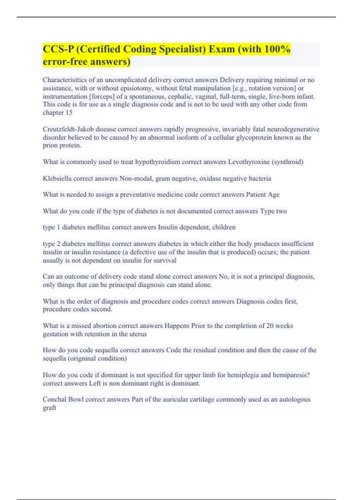 Characterisitics of an uncomplicated delivery correct answers Delivery requiring minimal or no assistance, with or without episiotomy, without fetal manipulation [e.g., rotation version] or instrumentation [forceps] of a spontaneous, cephalic, vaginal, full-term, single, live-born infant. This code is for use as a single diagnosis code and is not to be used with any other code from chapter 15 Creutzfeldt-Jakob disease correct answers rapidly progressive, invariably fatal neurodegenerative disorder believed to be caused by an abnormal isoform of a cellular glycoprotein known as the prion protein. What is commonly used to treat hypothyroidism correct answers Levothyroxine (synthroid) Klebsiella correct answers Non-modal, gram negative, oxidase negative bacteria What is needed to assign a preventative medicine code correct answers Patient Age What do you code if the type of diabetes is not documented correct answers Type two type 1 diabetes mellitus correct answers Insulin dependent, children type 2 diabetes mellitus correct answers diabetes in which either the body produces insufficient insulin or insulin resistance (a defective use of the insulin that is produced) occurs; the patient usually is not dependent on insulin for survival Can an outcome of delivery code stand alone correct answers No, it is not a principal diagnosis, only things that can be prinicipal diagnosis can stand alone. What is the order of diagnosis and procedure codes correct answers Diagnosis codes first, procedure codes second. What is a missed abortion correct answers Happens Prior to the completion of 20 weeks gestation with retention in the uterus How do you code sequella correct answers Code the residual condition and then the cause of the sequella (origninal condition) How do you code if dominant is not specified for upper limb for hemiplegia and hemiparesis? correct answers Left is non dominant right is dominant. Conchal Bowl correct answers Part of the auricular cartilage commonly used as an autologous graft