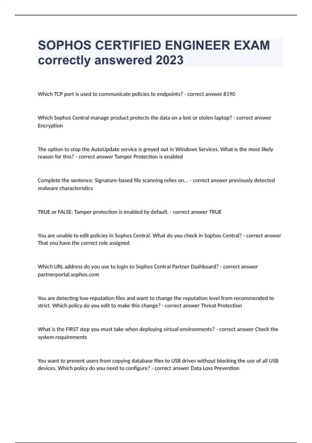 SOPHOS CERTIFIED ENGINEER EXAM correctly answered 2023Which TCP port is used to communicate policies to endpoints? - correct answer 8190 Which Sophos Central manage product protects the data on a lost or stolen laptop? - correct answer Encryption The option to stop the AutoUpdate service is greyed out in Windows Services. What is the most likely reason for this? - correct answer Tamper Protection is enabled Complete the sentence: Signature-based file scanning relies on... - correct answer previously detected malware characteristics TRUE or FALSE: Tamper protection is enabled by default. - correct answer TRUE You are unable to edit policies in Sophos Central. What do you check in Sophos Central? - correct answer That you have the correct role assigned Which URL address do you use to login to Sophos Central Partner Dashboard? - correct answer You are detecting low-reputation files and want to change the reputation level from recommended to strict. Which policy do you edit to make this change? - correct answer Threat Protection What is the FIRST step you must take when deploying virtual environments? - correct answer Check the system requirements You want to prevent users from copying database files to USB drives without blocking the use of all USB devices. Which policy do you need to configure? - correct answer Data Loss Prevention