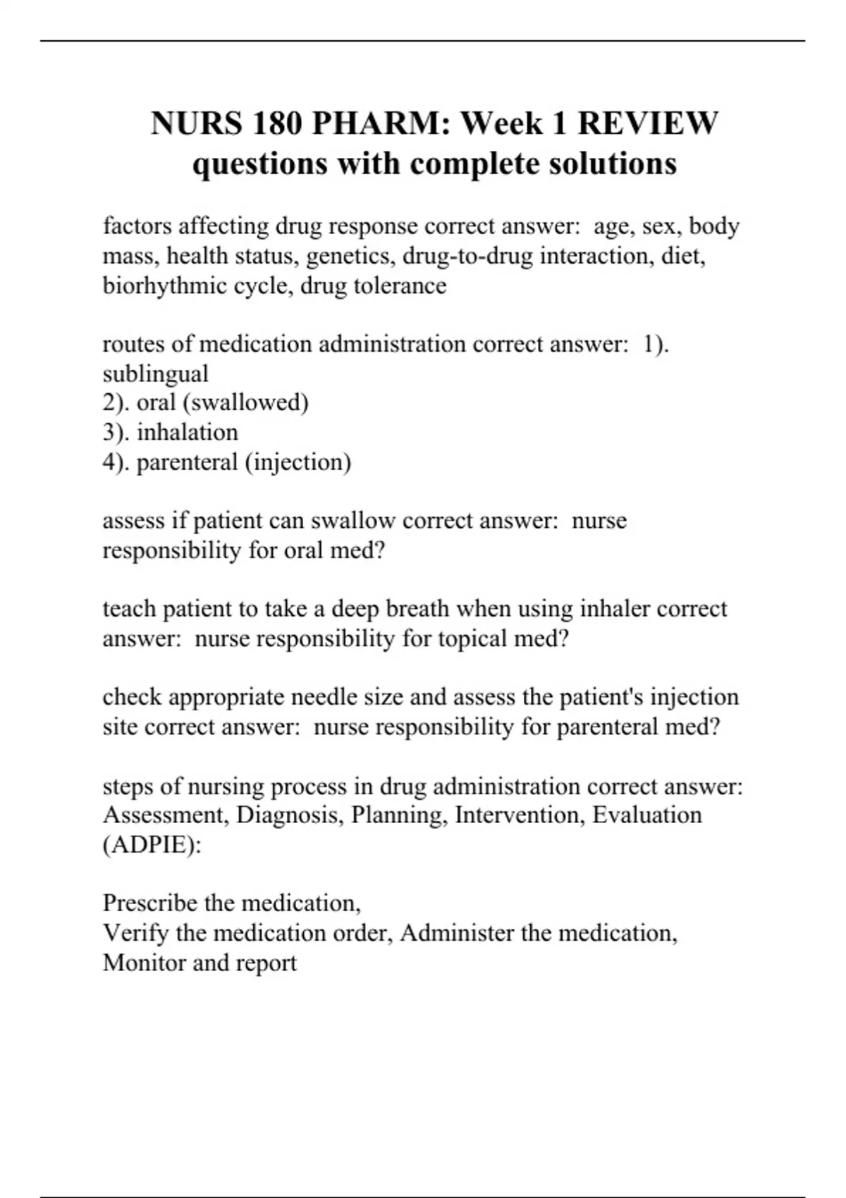 nurs 180 pharm week 1 review questions with complete solutions
