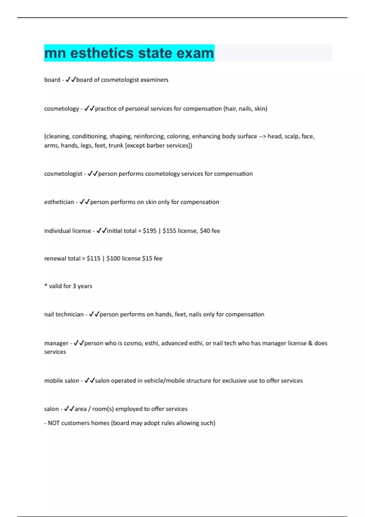 board - board of cosmetologist examiners cosmetology - practice of personal services for compensation (hair, nails, skin) (cleaning, conditioning, shaping, reinforcing, coloring, enhancing body surface --> head, scalp, face, arms, hands, legs, feet, trunk [except barber services]) cosmetologist - person performs cosmetology services for compensation esthetician - person performs on skin only for compensation individual license - initial total = $195 | $155 license, $40 fee renewal total = $115 | $100 license $15 fee * valid for 3 years nail technician - person performs on hands, feet, nails only for compensation manager - person who is cosmo, esthi, advanced esthi, or nail tech who has manager license & does services mobile salon - salon operated in vehicle/mobile structure for exclusive use to offer services salon - area / room(s) employed to offer services - NOT customers homes (board may adopt rules allowing such)