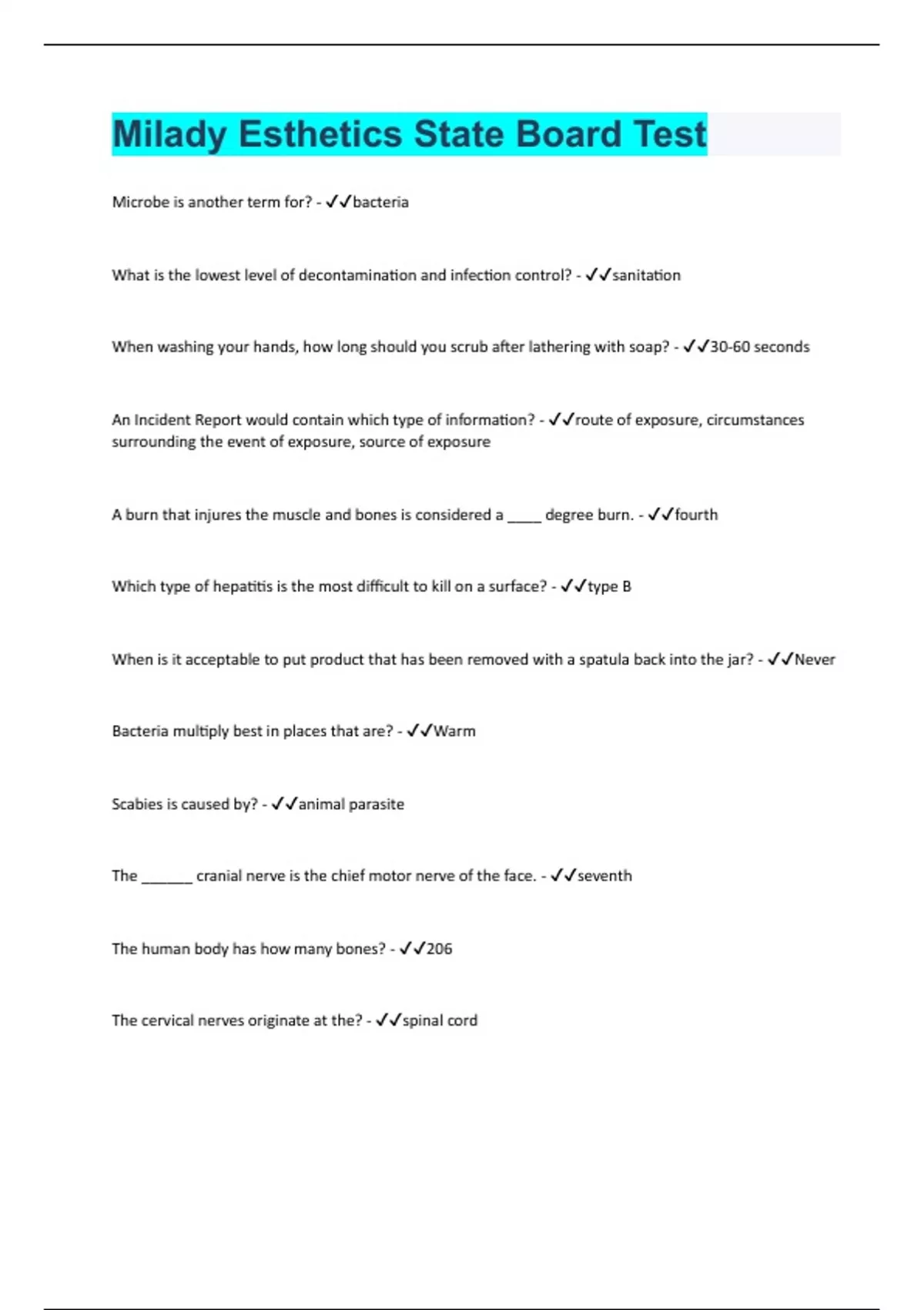 Microbe is another term for? - bacteria What is the lowest level of decontamination and infection control? - sanitation When washing your hands, how long should you scrub after lathering with soap? - 30-60 seconds An Incident Report would contain which type of information? - route of exposure, circumstances surrounding the event of exposure, source of exposure A burn that injures the muscle and bones is considered a ____ degree burn. - fourth Which type of hepatitis is the most difficult to kill on a surface? - type B When is it acceptable to put product that has been removed with a spatula back into the jar? - Never Bacteria multiply best in places that are? - Warm Scabies is caused by? - animal parasite The ______ cranial nerve is the chief motor nerve of the face. - seventh The human body has how many bones? - 206 The cervical nerves originate at the? - spinal cord