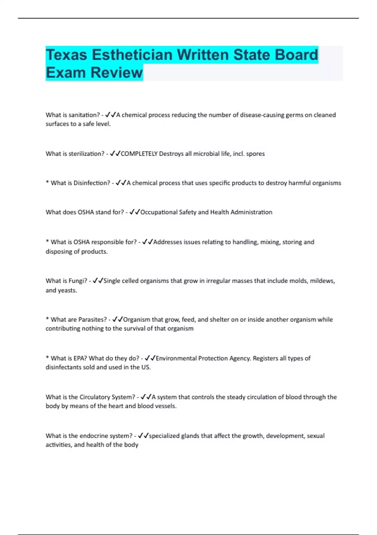What is sanitation? - A chemical process reducing the number of disease-causing germs on cleaned surfaces to a safe level. What is sterilization? - COMPLETELY Destroys all microbial life, incl. spores * What is Disinfection? - A chemical process that uses specific products to destroy harmful organisms What does OSHA stand for? - Occupational Safety and Health Administration * What is OSHA responsible for? - Addresses issues relating to handling, mixing, storing and disposing of products. What is Fungi? - Single celled organisms that grow in irregular masses that include molds, mildews, and yeasts. * What are Parasites? - Organism that grow, feed, and shelter on or inside another organism while contributing nothing to the survival of that organism * What is EPA? What do they do? - Environmental Protection Agency. Registers all types of disinfectants sold and used in the US. What is the Circulatory System? - A system that controls the steady circulation of blood through the body by means of the heart and blood vessels. What is the endocrine system? - specialized glands that affect the growth, development, sexual activities, and health of the body