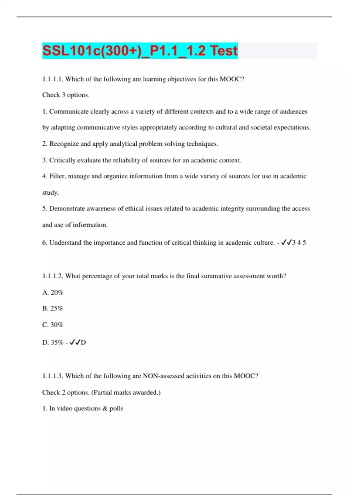 1.1.1.1, Which of the following are learning objectives for this MOOC? Check 3 options. 1. Communicate clearly across a variety of different contexts and to a wide range of audiences by adapting communicative styles appropriately according to cultural and societal expectations. 2. Recognize and apply analytical problem solving techniques. 3. Critically evaluate the reliability of sources for an academic context. 4. Filter, manage and organize information from a wide variety of sources for use in academic study. 5. Demonstrate awareness of ethical issues related to academic integrity surrounding the access and use of information. 6. Understand the importance and function of critical thinking in academic culture. - 3 4 5 1.1.1.2, What percentage of your total marks is the final summative assessment worth? A. 20% B. 25% C. 30% D. 35% - D 1.1.1.3, Which of the following are NON-assessed activities on this MOOC? Check 2 options. (Partial marks awarded.) 1. In video questions & polls