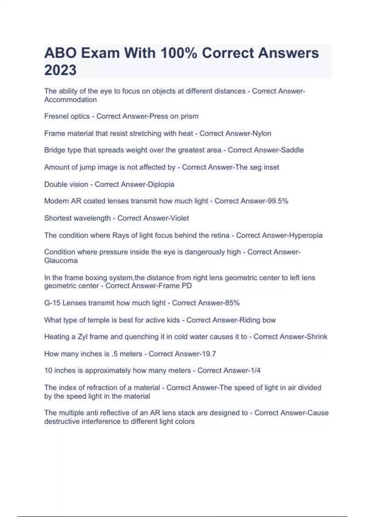 ABO Exam With 100% Correct Answers 2023. The ability of the eye to focus on objects at different distances - Correct AnswerAccommodation Fresnel optics - Correct Answer-Press on prism Frame material that resist stretching with heat - Correct Answer-Nylon Bridge type that spreads weight over the greatest area - Correct Answer-Saddle Amount of jump image is not affected by - Correct Answer-The seg inset Double vision - Correct Answer-Diplopia Modern AR coated lenses transmit how much light - Correct Answer-99.5% Shortest wavelength - Correct Answer-Violet The condition where Rays of light focus behind the retina - Correct Answer-Hyperopia Condition where pressure inside the eye is dangerously high - Correct AnswerGlaucoma In the frame boxing system,the distance from right lens geometric center to left lens geometric center - Correct Answer-Frame PD G-15 Lenses transmit how much light - Correct Answer-85% What type of temple is best for active kids - Correct Answer-Riding bow Heating a Zyl frame and quenching it in cold water causes it to - Correct Answer-Shrink How many inches is .5 meters - Correct Answer-19.7 10 inches is approximately how many meters - Correct Answer-1/4 The index of refraction of a material - Correct Answer-The speed of light in air divided by the speed light in the material .