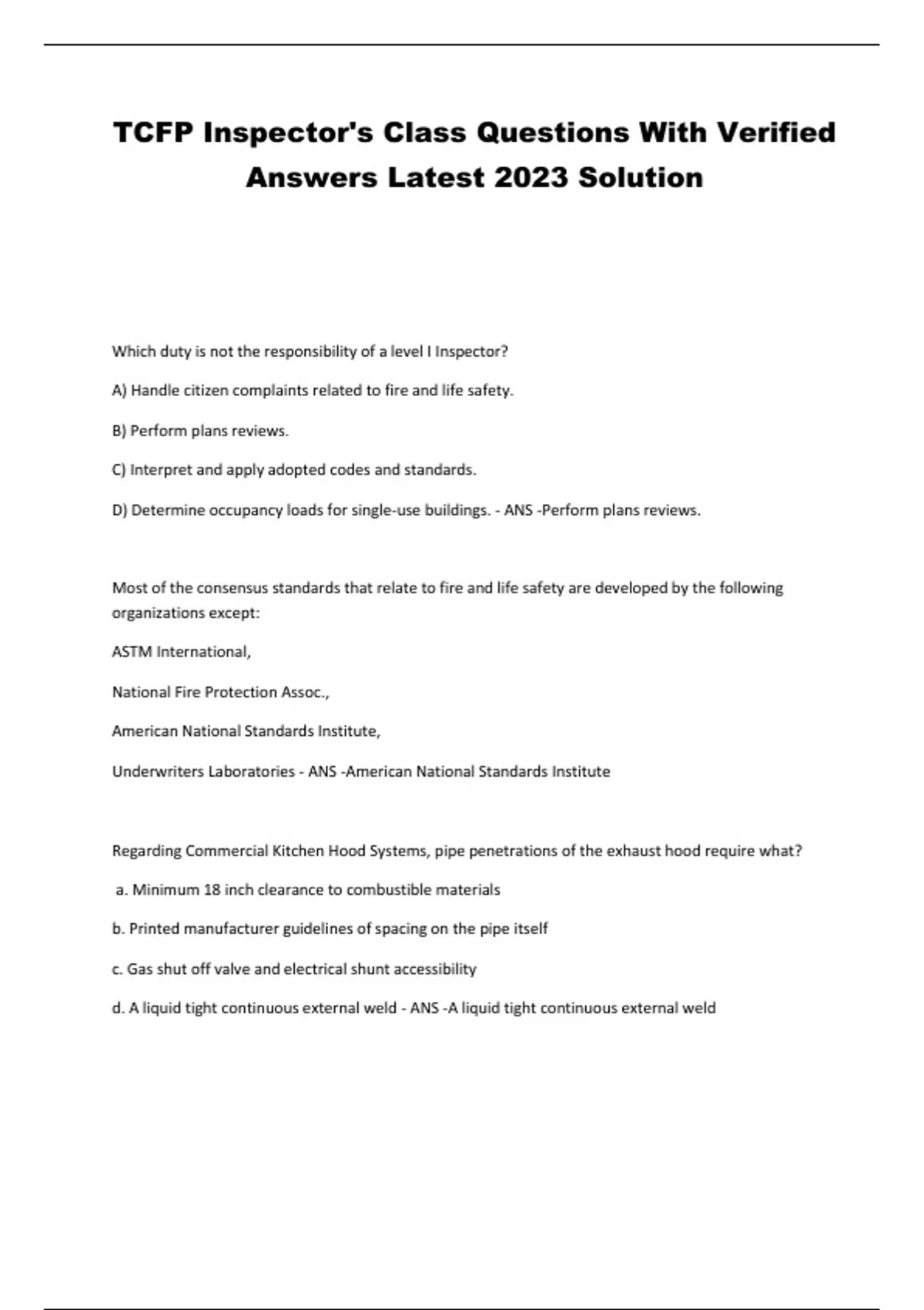 TCFP Inspector's Class Questions With Verified Answers Latest 2023 Solution Which duty is not the responsibility of a level I Inspector? A) Handle citizen complaints related to fire and life safety. B) Perform plans reviews. C) Interpret and apply adopted codes and standards. D) Determine occupancy loads for single-use buildings. - ANS -Perform plans reviews. Most of the consensus standards that relate to fire and life safety are developed by the following organizations except: ASTM International, National Fire Protection Assoc., American National Standards Institute, Underwriters Laboratories - ANS -American National Standards Institute Regarding Commercial Kitchen Hood Systems, pipe penetrations of the exhaust hood require what? a. Minimum 18 inch clearance to combustible materials b. Printed manufacturer guidelines of spacing on the pipe itself c. Gas shut off valve and electrical shunt accessibility d. A liquid tight continuous external weld - ANS -A liquid tight continuous external weld An independent, non-profit organization that tests products for their intended use and certifies them as safe describes: A) ASTM International B) American National Standards Institute C) Underwriters Laboratories Inc. D) Standards Council of Canada - ANS -Underwriters Laboratories Inc. Which is not one of the three general types of drawings used to show structure, facility, or site information? A. Plot plan B. Aerial view C. Floor plan D. Elevation view - ANS -Aerial view