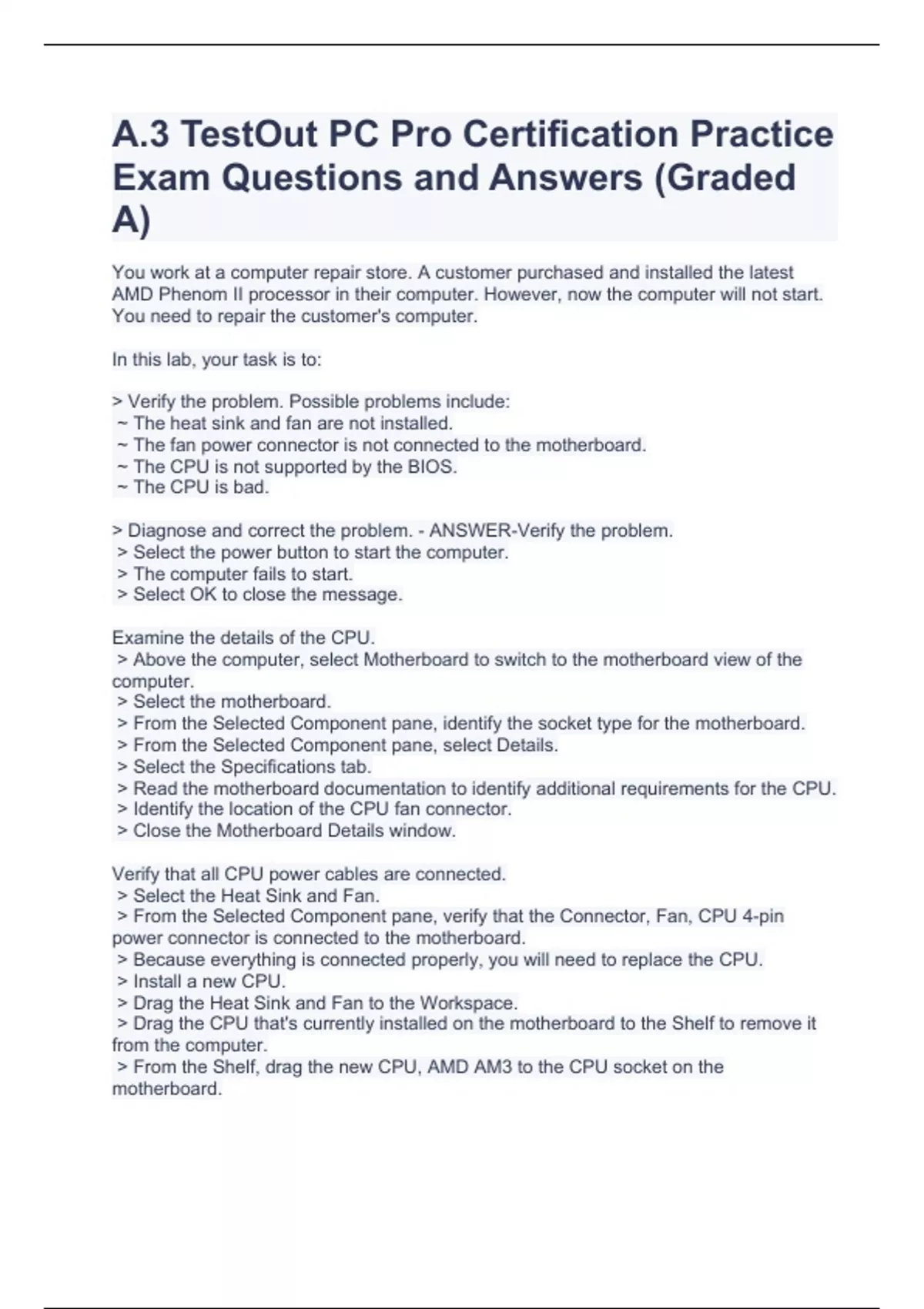 A.3 TestOut PC Pro Certification Practice Exam Questions and Answers (Graded A)A.3 TestOut PC Pro Certification Practice Exam Questions and Answers (Graded A)A.3 TestOut PC Pro Certification Practice Exam Questions and Answers (Graded A)You work at a computer repair store. A customer purchased and installed the latest AMD Phenom II processor in their computer. However, now the computer will not start. You need to repair the customer's computer. In this lab, your task is to: > Verify the problem. Possible problems include: ~ The heat sink and fan are not installed. ~ The fan power connector is not connected to the motherboard. ~ The CPU is not supported by the BIOS. ~ The CPU is bad. > Diagnose and correct the problem. - ANSWER-Verify the problem. > Select the power button to start the computer. > The computer fails to start. > Select OK to close the message. Examine the details of the CPU. > Above the computer, select Motherboard to switch to the motherboard view of the computer. > Select the motherboard. > From the Selected Component pane, identify the socket type for the motherboard. > From the Selected Component pane, select Details. > Select the Specifications tab. > Read the motherboard documentation to identify additional requirements for the CPU. > Identify the location of the CPU fan connector. > Close the Motherboard Details window. Verify that all CPU power cables are connected. > Select the Heat Sink and Fan. > From the Selected Component pane, verify that the Connector, Fan, CPU 4-pin power connector is connected to the motherboard. > Because everything is connected properly, you will need to replace the CPU. > Install a new CPU. > Drag the Heat Sink and Fan to the Workspace. > Drag the CPU that's currently installed on the motherboard to the Shelf to remove it from the computer. > From the Shelf, drag the new CPU, AMD AM3 to the CPU socket on the motherboard. > From the Workspace, drag the Heat Sink and Fan to the motherboard. > From the Selected Component pane, verify that the Connector, Fan, CPU 4-pin is still connected to the motherboard. > Above the computer, select Front to switch to the front view of the computer. > Select the power button to verify that the computer boots into Windows. You are one of the IT administrators for a corporate network. As you start each day, your job is to check the Issue Trax help desk system to see if any jobs have been submitted. You are working from the computer named ITAdmin.