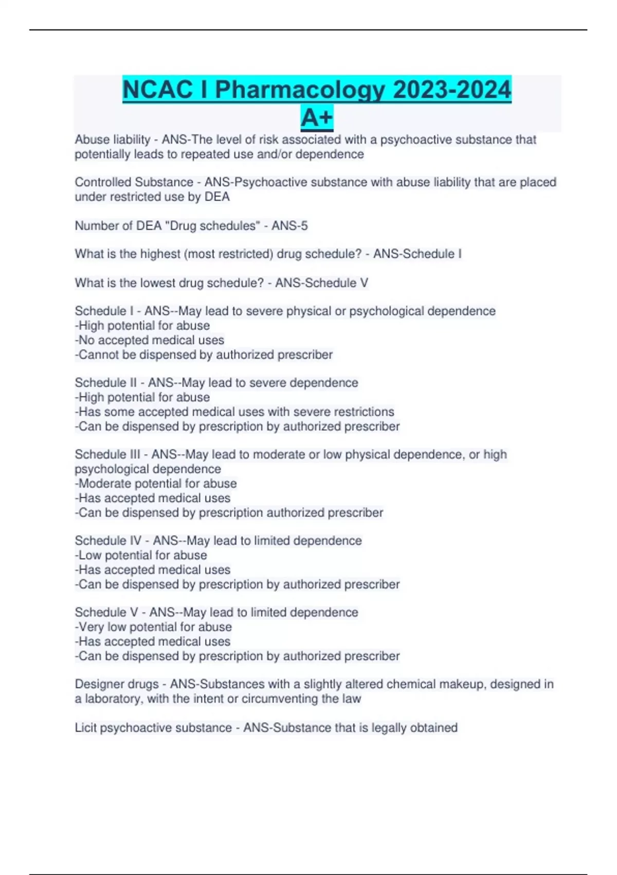 NCAC I Pharmacology A+ Abuse liability - ANS-The level of risk associated with a psychoactive substance that potentially leads to repeated use and/or dependence Controlled Substance - ANS-Psychoactive substance with abuse liability that are placed under restricted use by DEA Number of DEA "Drug schedules" - ANS-5 What is the highest (most restricted) drug schedule? - ANS-Schedule I What is the lowest drug schedule? - ANS-Schedule V Schedule I - ANS--May lead to severe physical or psychological dependence -High potential for abuse -No accepted medical uses -Cannot be dispensed by authorized prescriber Schedule II - ANS--May lead to severe dependence -High potential for abuse -Has some accepted medical uses with severe restrictions -Can be dispensed by prescription by authorized prescriber Schedule III - ANS--May lead to moderate or low physical dependence, or high psychological dependence -Moderate potential for abuse -Has accepted medical uses -Can be dispensed by prescription authorized prescriber Schedule IV - ANS--May lead to limited dependence -Low potential for abuse -Has accepted medical uses -Can be dispensed by prescription by authorized prescriber Schedule V - ANS--May lead to limited dependence -Very low potential for abuse -Has accepted medical uses -Can be dispensed by prescription by authorized prescriber Designer drugs - ANS-Substances with a slightly altered chemical makeup, designed in a laboratory, with the intent or circumventing the law Licit psychoactive substance - ANS-Substance that is legally obtained Illicit psychoactive substance - ANS-Substance that is illegally obtained What are the 2 main divisions of nervous system? - ANS-The CNS and PNS Components of central nervous system - ANS-The brain and the spinal cord Components of peripheral nervous system - ANS-Sensory pathways and motor pathways Subdivisions of motor pathways of PNS - ANS-1. Somatic (voluntary) 2. ANS (2 pathways) Subdivisions of ANS - ANS-1. Sympathetic 2. Parasympathetic Reticular activating system - ANS-Part of CNS responsible for arousal (sleep/wake) Limbic system - ANS-Part of CNS that regulates emotion Basal ganglia - ANS-Part of CNS responsible for involuntary and fine motor skils Cerebral cortex - ANS-Part of limbic system Hypothalamus - ANS-Part of brain that serves as the liaison between the ANS and the CNS Types of neurotransmitters (8) - ANS-1. Acetylcholine 2. Norepinephrine 3. Epinephrine 4. Dopamine 5. Serotonin 6. Gamma-amino-butyric acid (GABA) 7. Glutamate 8. Endogenous Opioids CNS Depressants - ANS-1. Alcohol (ETOH) 2. Barbiturates 3. Benzodiazepines *4. Opiates (but considered a "narcotic" in CAC II study materials) Types of Alcohol - ANS-1. Ethyl Alcohol (Ethanol) Ex: Beer, wine, liquor 2. Methyl alcohol (Methanol) Ex: Wood alcohol 3. Isopropyl (Isopropanol) Ex: Rubbing alcohol...