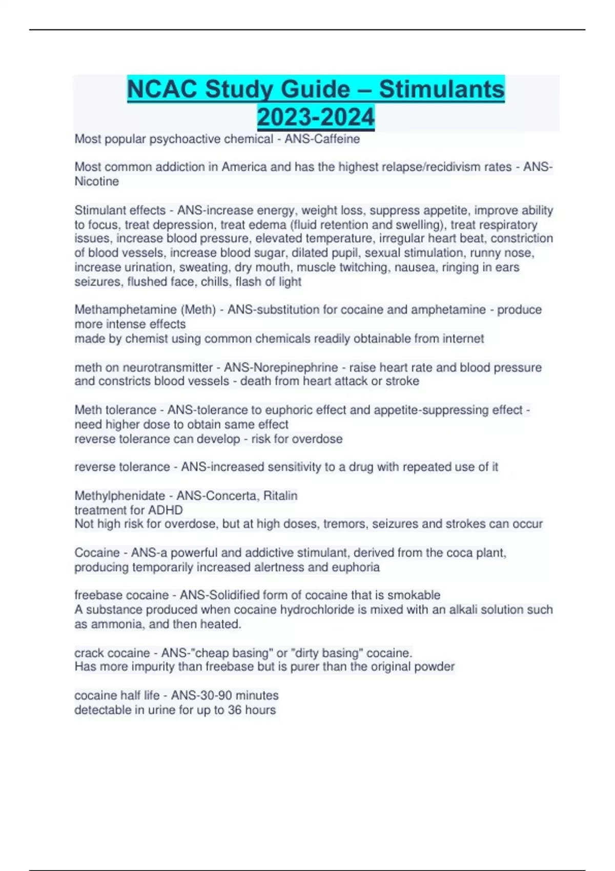 NCAC Study Guide – Stimulants Most popular psychoactive chemical - ANS-Caffeine Most common addiction in America and has the highest relapse/recidivism rates - ANSNicotine Stimulant effects - ANS-increase energy, weight loss, suppress appetite, improve ability to focus, treat depression, treat edema (fluid retention and swelling), treat respiratory issues, increase blood pressure, elevated temperature, irregular heart beat, constriction of blood vessels, increase blood sugar, dilated pupil, sexual stimulation, runny nose, increase urination, sweating, dry mouth, muscle twitching, nausea, ringing in ears seizures, flushed face, chills, flash of light Methamphetamine (Meth) - ANS-substitution for cocaine and amphetamine - produce more intense effects made by chemist using common chemicals readily obtainable from internet meth on neurotransmitter - ANS-Norepinephrine - raise heart rate and blood pressure and constricts blood vessels - death from heart attack or stroke Meth tolerance - ANS-tolerance to euphoric effect and appetite-suppressing effect - need higher dose to obtain same effect reverse tolerance can develop - risk for overdose reverse tolerance - ANS-increased sensitivity to a drug with repeated use of it Methylphenidate - ANS-Concerta, Ritalin treatment for ADHD Not high risk for overdose, but at high doses, tremors, seizures and strokes can occur Cocaine - ANS-a powerful and addictive stimulant, derived from the coca plant, producing temporarily increased alertness and euphoria freebase cocaine - ANS-Solidified form of cocaine that is smokable A substance produced when cocaine hydrochloride is mixed with an alkali solution such as ammonia, and then heated. crack cocaine - ANS-"cheap basing" or "dirty basing" cocaine. Has more impurity than freebase but is purer than the original powder cocaine half life - ANS-...