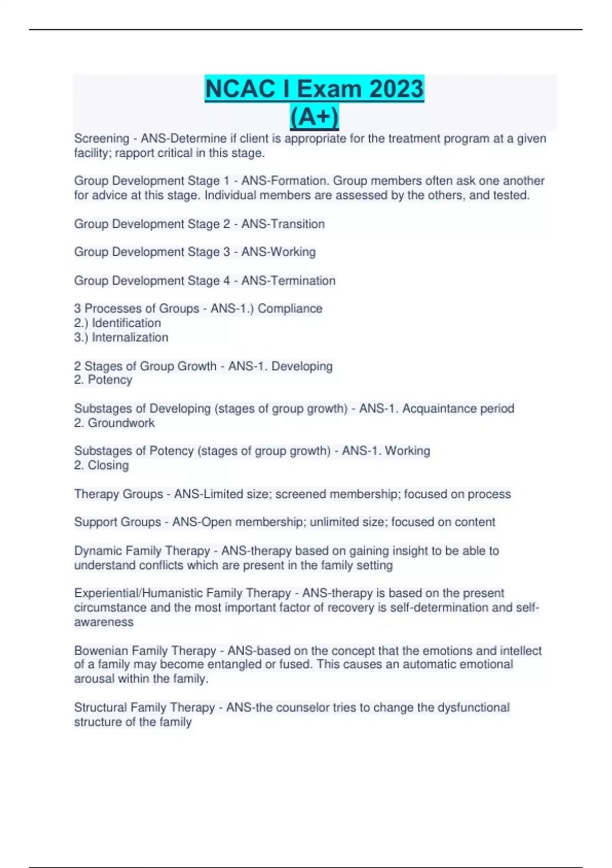 NCAC I Exam 2023 (A+) Screening - ANS-Determine if client is appropriate for the treatment program at a given facility; rapport critical in this stage. Group Development Stage 1 - ANS-Formation. Group members often ask one another for advice at this stage. Individual members are assessed by the others, and tested. Group Development Stage 2 - ANS-Transition Group Development Stage 3 - ANS-Working Group Development Stage 4 - ANS-Termination 3 Processes of Groups - ANS-1.) Compliance 2.) Identification 3.) Internalization 2 Stages of Group Growth - ANS-1. Developing 2. Potency Substages of Developing (stages of group growth) - ANS-1. Acquaintance period 2. Groundwork Substages of Potency (stages of group growth) - ANS-1. Working 2. Closing Therapy Groups - ANS-Limited size; screened membership; focused on process Support Groups - ANS-Open membership; unlimited size; focused on content Dynamic Family Therapy - ANS-therapy based on gaining insight to be able to understand conflicts which are present in the family setting Experiential/Humanistic Family Therapy - ANS-therapy is based on the present circumstance and the most important factor of recovery is self-determination and selfawareness Bowenian Family Therapy - ANS-based on the concept that the emotions and intellect of a family may become entangled or fused. This causes an automatic emotional arousal within the family. Structural Family Therapy - ANS-the counselor tries to change the dysfunctional structure of the family Continues...