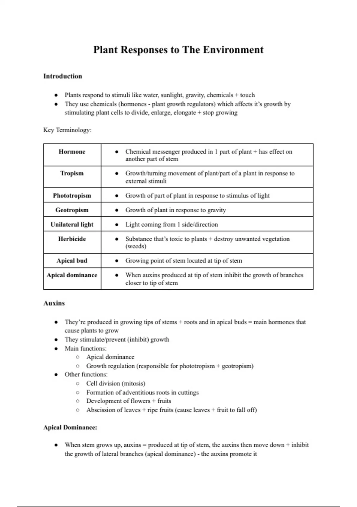 Matric Life Sciences notes on Plant Responses to The Environment.