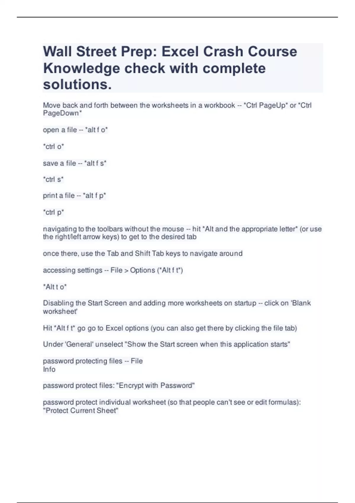 Wall Street Prep: Excel Crash Course Knowledge check with complete solutions | Latest 2023/2024 Move back and forth between the worksheets in a workbook -- *Ctrl PageUp* or *Ctrl PageDown* open a file -- *alt f o* *ctrl o* save a file -- *alt f s* *ctrl s* print a file -- *alt f p* *ctrl p* navigating to the toolbars without the mouse -- hit *Alt and the appropriate letter* (or use the right/left arrow keys) to get to the desired tab once there, use the Tab and Shift Tab keys to navigate around accessing settings -- File Options (*Alt f t*) *Alt t o* Disabling the Start Screen and adding more worksheets on startup -- click on 'Blank worksheet' Hit *Alt f t* go go to Excel options (you can also get there by clicking the file tab) Under 'General' unselect "Show the Start screen when this application starts" password protecting files -- File Info password protect files: "Encrypt with Password" password protect individual worksheet (so that people can't see or edit formulas): "Protect Current Sheet" highlighting columns and rows -- columns: *Ctr