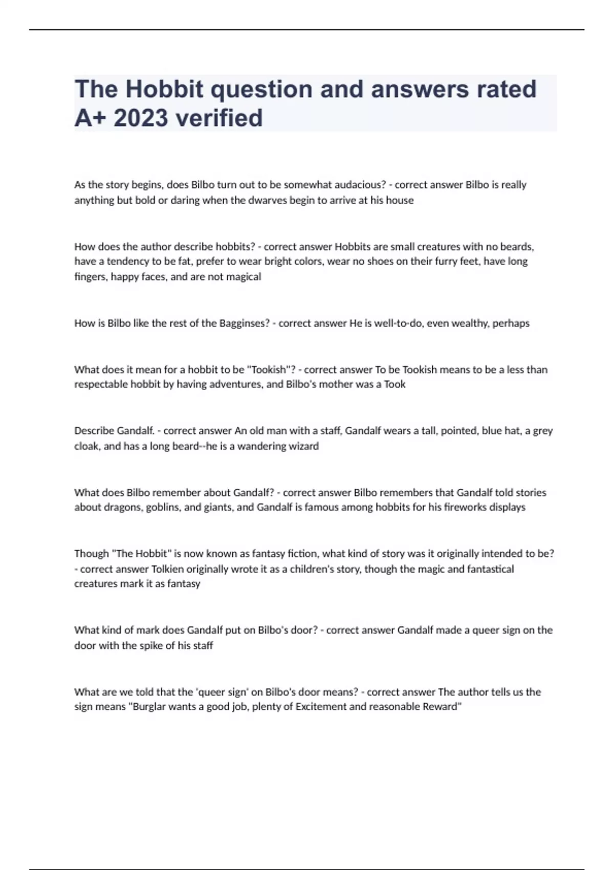 The Hobbit question and answers rated A+ 2023 verified As the story begins, does Bilbo turn out to be somewhat audacious? - correct answer Bilbo is really anything but bold or daring when the dwarves begin to arrive at his house How does the author describe hobbits? - correct answer Hobbits are small creatures with no beards, have a tendency to be fat, prefer to wear bright colors, wear no shoes on their furry feet, have long fingers, happy faces, and are not magical How is Bilbo like the rest of the Bagginses? - correct answer He is well-to-do, even wealthy, perhaps What does it mean for a hobbit to be "Tookish"? - correct answer To be Tookish means to be a less than respectable hobbit by having adventures, and Bilbo's mother was a Took Describe Gandalf. - correct answer An old man with a staff, Gandalf wears a tall, pointed, blue hat, a grey cloak, and has a long beard--he is a wandering wizard What does Bilbo remember about Gandalf? - correct answer Bilbo remembers that Gandalf told stories about dragons, goblins, and giants, and Gandalf is famous among hobbits for his fireworks displays Though "The Hobbit" is now known as fantasy fiction, what kind of story was it originally intended to be? - correct answer Tolkien originally wrote it as a children's story, though the magic and fantastical creatures mark it as fantasy What kind of mark does Gandalf put on Bilbo's door? - correct answer Gandalf made a queer sign on the door with the spike of his staff What are we told that the 'queer sign' on Bilbo's door means? - correct answer The author tells us the sign means "Burglar wants a good job, plenty of Excitement and reasonable Reward" Why does Gandalf want a burglar rather than a hero or a warrior? - correct answer Heroes are scarce, and all the warriors are busy fighting each other--since stealing will be required, a burglar is a better choice anyway Why does Gandalf put the mark on Bilbo's door? - correct answer To signal the dwarves that Bilbo's house was where they were to meet How many dwarves arrive at Bilbo's house? - correct answer Thirteen dwarves arrive, all wearing different-colored hooded cloaks Who is Thorin? - correct answer Thorin, the leader of the group of dwarves, is the grandson of Thror, who was King Under the Mountain, and Thorin is his heir What two things does Gandalf give Thorin? - correct answer Gandalf gives Thorin a map of the Mountain showing a hidden door, and a key How did the dwarves lose their treasure and kingdom? - correct answer Smaug is the dragon who flew in to the mountain, destroyed the kingdom, and most of Thorin's ancestors, and stole the treasure What are the terms of Bilbo's contract? - correct answer Bilbo is to receive one fourteenth of the treasure, payment of all of his travel expenses, and funeral expenses to be paid (if needed) What does the author tell us about dragons in general? - correct answer Dragons steal gold and jewels, live forever unless killed, do no work, make nothing themselves, and both fly and breathe fire Why is Dale important? - correct answer Located near the Mountain, the dwarves sold magical, wonderful toys to the people of Dale, who in turn became rich by selling the toys made by the dwarves What is the point of view of this story? - correct answer Told mainly by a Third-Person Narrator, though the narrator occasionally speaks directly to the reader What two items does Bilbo forget in his rush to meet the dwarves, and what does this say about Bilbo's willingness to go on the adventure? - correct answer He forgets a handkerchief and his hat, which