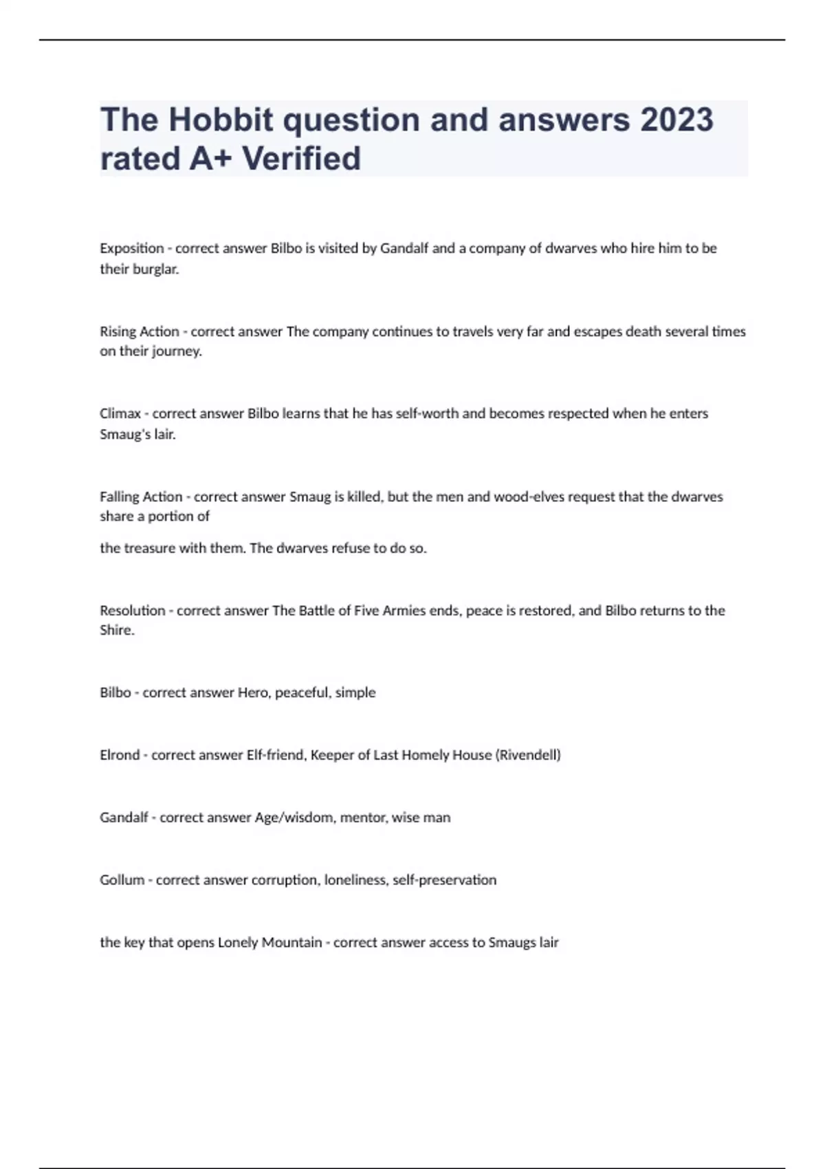 The Hobbit question and answers 2023 rated A+ VerifiedExposition - correct answer Bilbo is visited by Gandalf and a company of dwarves who hire him to be their burglar. Rising Action - correct answer The company continues to travels very far and escapes death several times on their journey. Climax - correct answer Bilbo learns that he has self-worth and becomes respected when he enters Smaug's lair. Falling Action - correct answer Smaug is killed, but the men and wood-elves request that the dwarves share a portion of the treasure with them. The dwarves refuse to do so. Resolution - correct answer The Battle of Five Armies ends, peace is restored, and Bilbo returns to the Shire. Bilbo - correct answer Hero, peaceful, simple Elrond - correct answer Elf-friend, Keeper of Last Homely House (Rivendell) Gandalf - correct answer Age/wisdom, mentor, wise man Gollum - correct answer corruption, loneliness, self-preservation the key that opens Lonely Mountain - correct answer access to Smaugs lair Lonely Mountain - correct answer Ultimate destination-represents greed and materialism