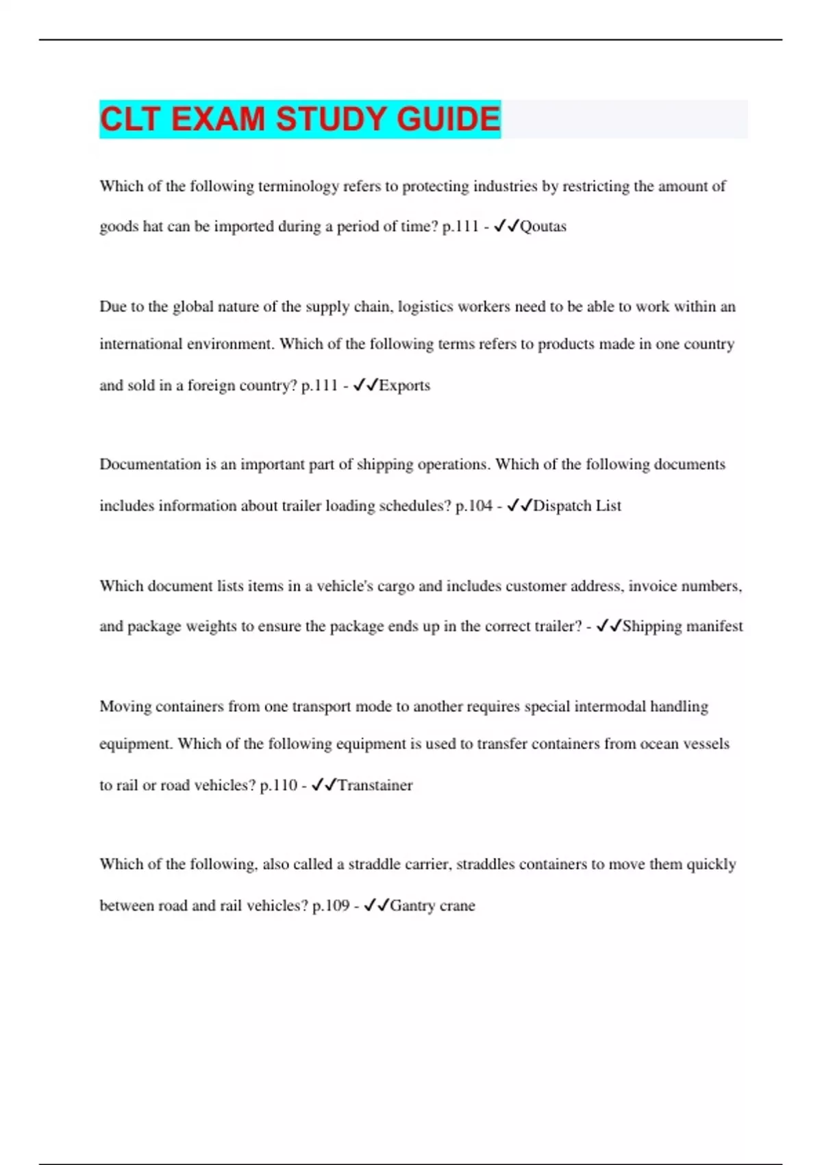 Which of the following terminology refers to protecting industries by restricting the amount of goods hat can be imported during a period of time? p.111 - Qoutas Due to the global nature of the supply chain, logistics workers need to be able to work within an international environment. Which of the following terms refers to products made in one country and sold in a foreign country? p.111 - Exports Documentation is an important part of shipping operations. Which of the following documents includes information about trailer loading schedules? p.104 - Dispatch List Which document lists items in a vehicle's cargo and includes customer address, invoice numbers, and package weights to ensure the package ends up in the correct trailer? - Shipping manifest Moving containers from one transport mode to another requires special intermodal handling equipment. Which of the following equipment is used to transfer containers from ocean vessels to rail or road vehicles? p.110 - Transtainer Which of the following, also called a straddle carrier, straddles containers to move them quickly between road and rail vehicles? p.109 - Gantry crane