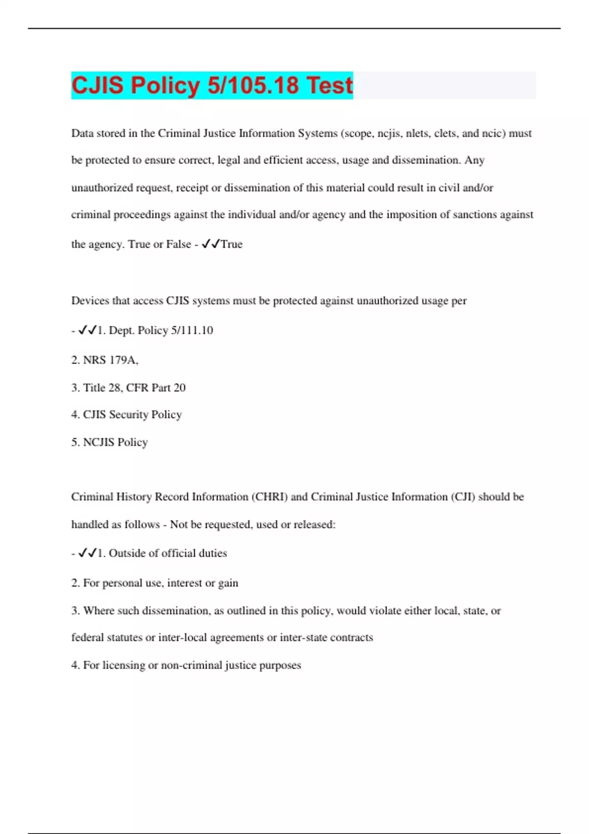 Data stored in the Criminal Justice Information Systems (scope, ncjis, nlets, clets, and ncic) must be protected to ensure correct, legal and efficient access, usage and dissemination. Any unauthorized request, receipt or dissemination of this material could result in civil and/or criminal proceedings against the individual and/or agency and the imposition of sanctions against the agency. True or False - True Devices that access CJIS systems must be protected against unauthorized usage per - 1. Dept. Policy 5/111.10 2. NRS 179A, 3. Title 28, CFR Part 20 4. CJIS Security Policy 5. NCJIS Policy Criminal History Record Information (CHRI) and Criminal Justice Information (CJI) should be handled as follows - Not be requested, used or released: - 1. Outside of official duties 2. For personal use, interest or gain 3. Where such dissemination, as outlined in this policy, would violate either local, state, or federal statutes or inter-local agreements or inter-state contracts 4. For licensing or non-criminal j