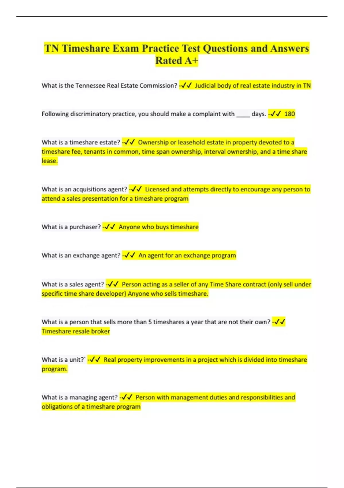 TN Timeshare Exam Practice Test Questions and Answers Rated A+ What is the Tennessee Real Estate Commission? - Judicial body of real estate industry in TN Following discriminatory practice, you should make a complaint with ____ days. - 180 What is a timeshare estate? - Ownership or leasehold estate in property devoted to a timeshare fee, tenants in common, time span ownership, interval ownership, and a time share lease. What is an acquisitions agent? - Licensed and attempts directly to encourage any person to attend a sales presentation for a timeshare program What is a purchaser? - Anyone who buys timeshare What is an exchange agent? - An agent for an exchange program What is a sales agent? - Person acting as a seller of any Time Share contract (only sell under specific time share developer) Anyone who sells timeshare. What is a person that sells more than 5 timeshares a year that are not their own? - Timeshare resale broker What is a unit?` - Real property improvements in a project which is divided into timeshare program. What is a managing agent? - Person with management duties and responsibilities and obligations of a timeshare program What are timeshare units? (what can be a timeshare) - Anything can be a timeshare unit unless expressly prohibited by project instruments or local governing laws What should be included in the Public Offering Statement? - name of county where property is located legal description of property ID of time periods by letter, name and number ID of timeshare estates and how many units can be a timeshare Common expenses and voting rights any restrictions on use occupancy alterations or alienation of timeshare units ownership interest/maintenance provisions/ replacement