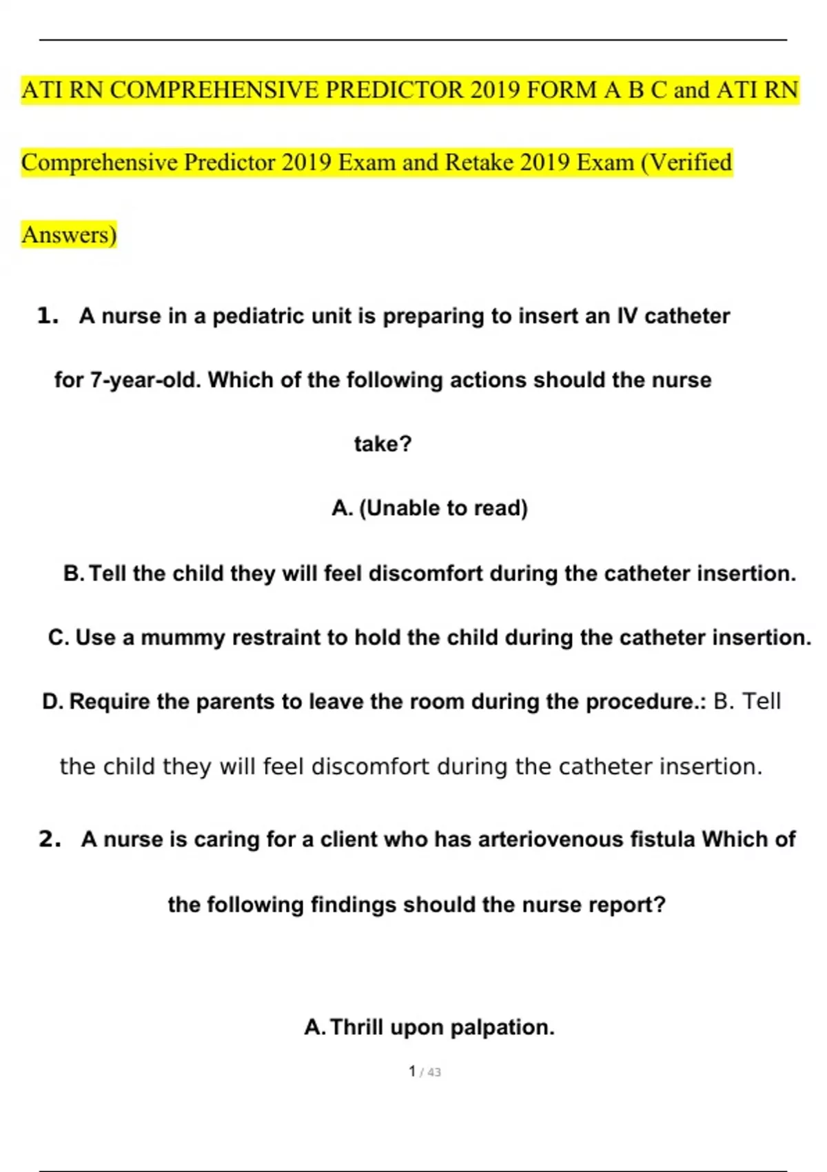 ATI RN COMPREHENSIVE PREDICTOR 2019 FORM A B C and ATI RN Comprehensive Predictor 2019 Exam and Retake 2019 Exam (Verified Answers)