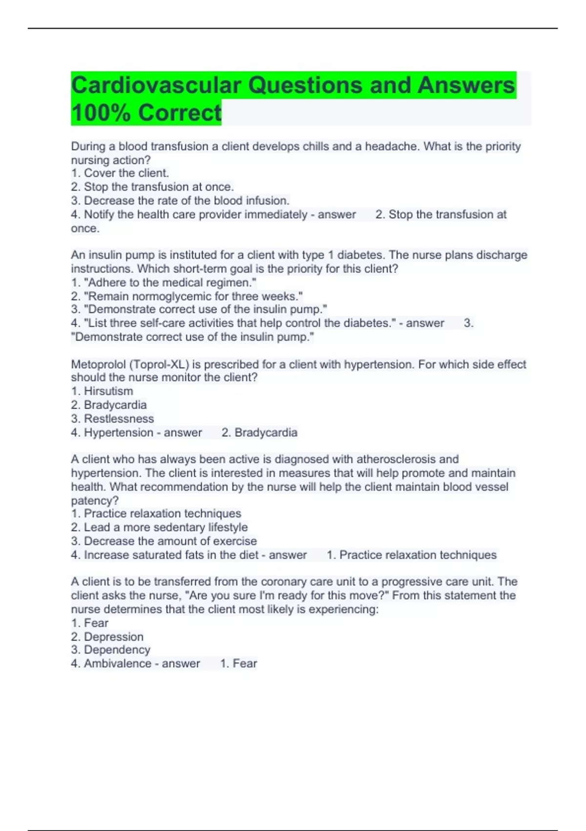 Cardiovascular Questions and Answers 100% Correct During a blood transfusion a client develops chills and a headache. What is the priority nursing action? 1. Cover the client. 2. Stop the transfusion at once. 3. Decrease the rate of the blood infusion. 4. Notify the health care provider immediately 2. Stop the transfusion at once. An insulin pump is instituted for a client with type 1 diabetes. The nurse plans discharge instructions. Which short-term goal is the priority for this client? 1. "Adhere to the medical regimen." 2. "Remain normoglycemic for three weeks." 3. "Demonstrate correct use of the insulin pump." 4. "List three self-care activities that help control the diabetes." 3. "Demonstrate correct use of the insulin pump." Metoprolol (Toprol-XL) is prescribed for a client with hypertension. For which side effect should the nurse monitor the client? 1. Hirsutism 2. Bradycardia 3. Restlessness 4. Hypertension 2. Bradycardia A client who has always been active is diagnosed with atherosclerosis and hypertension. The client is interested in measures that will help promote and maintain health. What recommendation by the nurse will help the client maintain blood vessel patency? 1. Practice relaxation techniques 2. Lead a more sedentary lifestyle 3. Decrease the amount of exercise 4. Increase saturated fats in the diet 1. Practice relaxation techniques A client is to be transferred from the coronary care unit to a progressive care unit. The client asks the nurse, "Are you sure I'm ready for this move?" From this statement the nurse determines that the client most likely is experiencing: 1. Fear 2. Depression 3. Dependency 4. Ambivalence 1. Fear When two nurses are getting an older adult out of bed, the client reports feeling lightheaded. The nurse identifies that the client's pulse is stable and the client's color has not changed. What should the nurses assist the client to do? 1. Slide slowly to the floor to prevent a fall and injury. 2. Sit on the edge of the bed while they hold the client upright. 3. Bend forward because this will increase blood flow to the brain. 4. Lie down quickly so the legs can be raised above the heart level. 2. Sit on the edge of the bed while they hold the client upright. A client with intermittent claudication has been instructed to stop smoking. The nurse explains that the reason that the client should quit smoking is because: 1. "The policy states that the hospital is a smoke-free environment." 2. "Nicotine causes arteries to go into spasm, which decreases circulation." 3. "Cigarette smoking is not suggested for clients like you that have vascular problems." 4. "The health care provider may allow you to begin smoking again after you are feeling better." 3. "Cigarette smoking is not suggested for clients like you that have vascular problems." A client with heart failure is on a drug regimen of digoxin (Lanoxin) and furosemide (Lasix). The client dislikes oranges and bananas. Which fruit should the nurse encourage the client to eat? 1. Apples 2. Grapes 3. Apricots 4. Cranberries 3. Apricots A nurse is teaching a health class to older adult women about heart disease. The nurse discusses the most common prodromal symptom reported by women with acute coronary heart disease that usually is not experienced by men. What response indicates that a woman understood the teaching? 1. Unusual fatigue 2. Shortness of breath 3. Crushing pain in the chest 4. Substernal pressure radiating to the neck 1. Unusual fatigue A nurse is auscultating a client's heart sounds. Which valves close when the first heart sounds are produced? 1. Mitral and tricuspid 2. Aortic and tricuspid 3. Mitral and pulmonic 4. Aortic and pulmonic 1. Mitral and tricuspid A client on a telemetry unit demonstrates a regular sinus rhythm (RSR) with an occasional premature atrial contraction (PAC). What action should the nurse take? 1. Continue to monitor the client. 2. Notify the health care provider. 3. Ensure that a defibrillator is close by. 4. Administer lidocaine intravenously as per protocol. 1. Continue to monitor the client.
