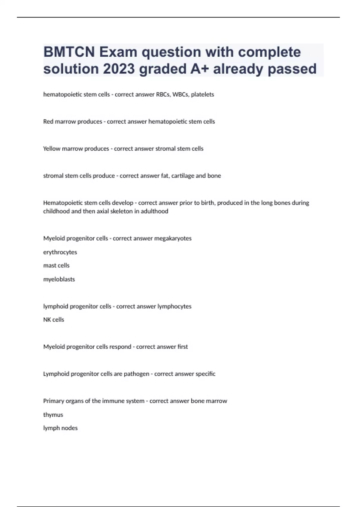 BMTCN Exam question with complete solution 2023 graded A+ already passedhematopoietic stem cells - correct answer RBCs, WBCs, platelets Red marrow produces - correct answer hematopoietic stem cells Yellow marrow produces - correct answer stromal stem cells stromal stem cells produce - correct answer fat, cartilage and bone Hematopoietic stem cells develop - correct answer prior to birth, produced in the long bones during childhood and then axial skeleton in adulthood Myeloid progenitor cells - correct answer megakaryotes erythrocytes mast cells myeloblasts lymphoid progenitor cells - correct answer lymphocytes NK cells Myeloid progenitor cells respond - correct answer first Lymphoid progenitor cells are pathogen - correct answer specific Primary organs of the immune system - correct answer bone marrow thymus lymph nodes