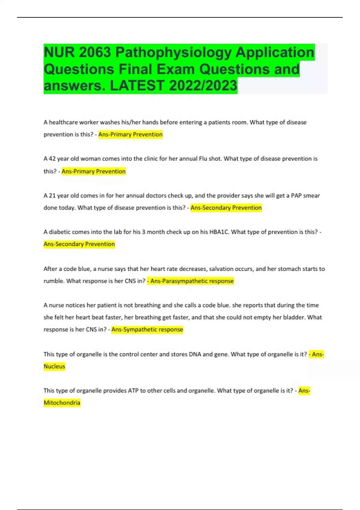NUR 2063 Pathophysiology Application Questions Final Exam Questions and answers. LATEST 2022/2023 Document Content and Description Below A healthcare worker washes his/her hands before entering a patients room. What type of disease prevention is this? - Ans-Primary Prevention A 42 year old woman comes into the clinic for her annual Flu shot. What type of disease prevention is this? - Ans-Primary Prevention A 21 year old comes in for her annual doctors check up, and the provider says she will get a PAP smear done today. What type of disease prevention is this? - Ans-Secondary Prevention A diabetic comes into the lab for his 3 month check up on his HBA1C. What type of prevention is this? - Ans-Secondary Prevention After a code blue, a nurse says that her heart rate decreases, salvation occurs, and her stomach starts to rumble. What response is her CNS in? - Ans-Parasympathetic response A nurse notices her patient is not breathing and she calls a code blue. she reports that during the time she felt her heart beat faster, her breathing get faster, and that she could not empty her bladder. What response is her CNS in? - Ans-Sympathetic response This type of organelle is the control center and stores DNA and gene. What type of organelle is it? - Ans-Nucleus This type of organelle provides ATP to other cells and organelle. What type of organelle is it? - Ans-Mitochondria This type of organelle produces RNA and transcribes and translates DNA and RNA. What type of organelle is it? - Ans-Ribosome This type of organelle breaks down and digests dead cells, organelles and tissues. What type of organelle is it? - Ans-Lysosome This type of organelle is a folded membrane that helps move proteins around the cell. What type of organelle is it? - Ans-Rough ER This type of organelle helps to detoxify liver and kidney cells, lipid metabolism and synthesis of hormones. What type of organelle is it? - Ans-Smooth ER This type of organelle contains oxidase and catalase for breaking down hydrogen peroxide and metabolic wastes. What type of organelle is it? - Ans-Peroxisome This type of organelle helps the ER move things in and out of the cell. What type of organelle is it? - Ans-Golgi body A mom breastfeeds her 3 month old child. What type of immunity is the mom passing onto her child through this act? - Ans-Passive immunity A mother brings her child in for the hepatitis B. vaccine. What type of immunity is given through vaccinations? - Ans-Active immunity A child begins to have an allergic reaction to a bee sting. What type of hypersensitivity is it and what is the mediator? - Ans-Type 1 hypersensitivity, IgE mediator A child starts to develop red blisters, wheezing, and a runny nose after eating a peanut butter sandwich. Name the mediator responsible for these symptoms. - Ans-IgE mediator Blood transfusion reactions occur when the wrong blood is given to a patient, causing the blood to hemolyze and clump What is the hypersensitivity responsible for this and the mediator? - Ans-Type 2 hypersensitivity, Cytotoxic mediator A mom of a baby finds out the the baby has a positive blood type, while the mom has a negative blood type, causing the babies blood cells to be destroyed if Rhogam is not given to the mom. What type of mediator is involved with this situation? - Ans-Cytotoxic mediator Rheumatoid Arthritis and Lupus involve the immune system attacking its own tissues. What type of hypersensitivity is this and what is the mediator? - Ans-Type 3 hypersensitivity, Immune Complex mediator A child is seen to have red bumps on their skin 2 days after a hiking trip. The child said he accidentally ran into a bush. What type of hypersensitivity is this and what is the mediator? - Ans-Type 4 hypersensitivity, delayed cell mediator A client comes in for a TB test for work. He is then asked to come in 2 days later to have his test read. He questions why he has to do this. Explain why he has to do this and the type of mediator involved. - Ans-The cells responsible for the reaction are delayed and do not show up on the skin until at least 48 hours after the test. Delayed cell mediator A client finds a small tumor on her wrist that is spherical shaped and moves when her wrist moves. She says that over the last 5 years that her wrist went from nothing to a small coin size diameter for the tumor. What type of tumor does the client most likely have? - Ans-Benign tumor On her last mammogram, a 55 year old client is notified by her doctor that there is a mass on her right breast that is irregularly shaped. What type of tumor is this and should she be worried about it? - Ans-Malignant tumor. Yes she should be worried as the tumor can grow rapidly and move to other area