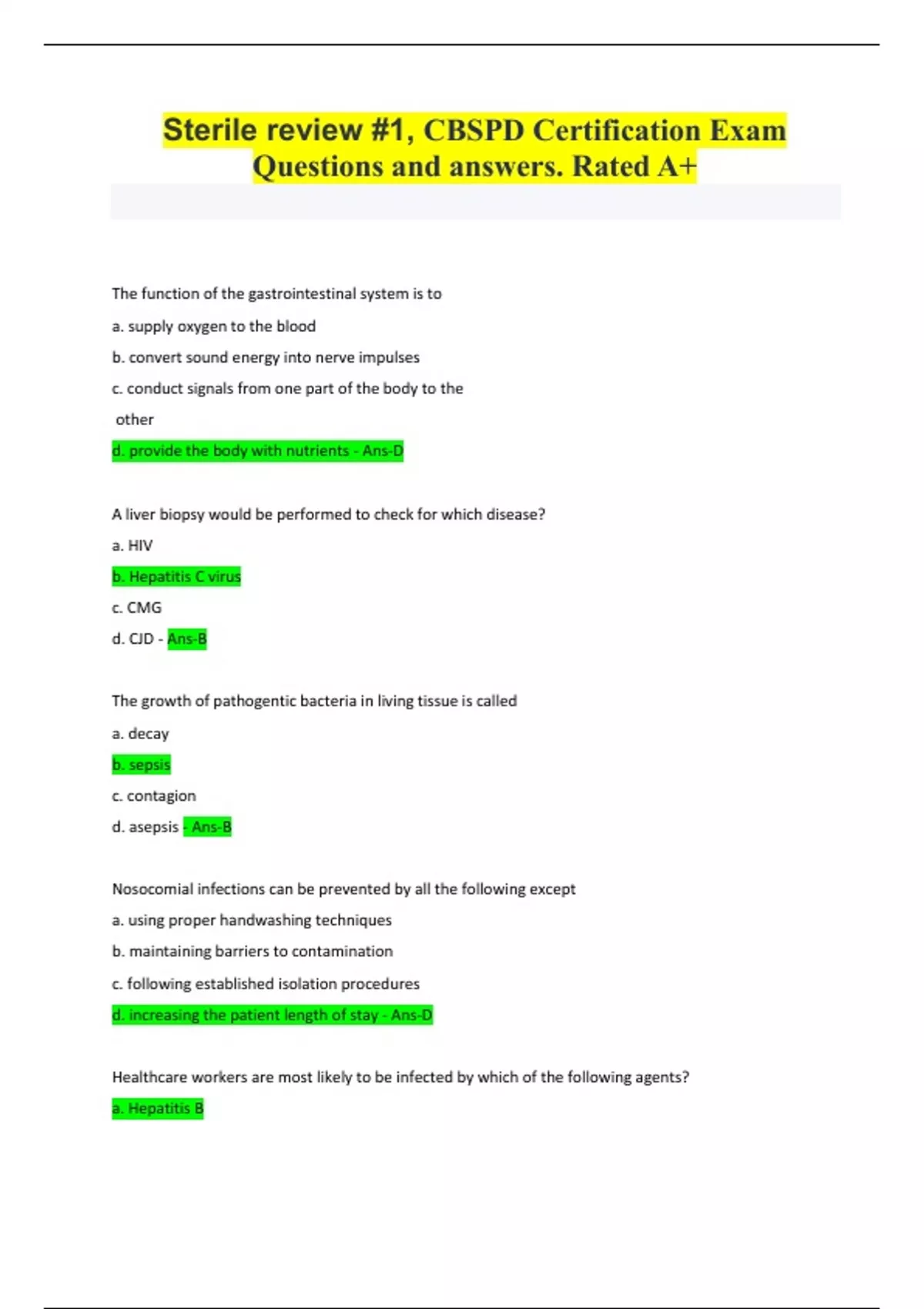 Sterile review #1, CBSPD Certification Exam Questions and answers. Rated A+ Document Content and Description Below The function of the gastrointestinal system is to a. supply oxygen to the blood b. convert sound energy into nerve impulses c. conduct signals from one part of the body to the other d. provide the body with nutrients - Ans-D A liver biopsy would be performed to check for which disease? a. HIV b. Hepatitis C virus c. CMG d. CJD - Ans-B The growth of pathogentic bacteria in living tissue is called a. decay b. sepsis c. contagion d. asepsis - Ans-B Nosocomial infections can be prevented by all the following except a. using proper handwashing techniques b. maintaining barriers to contamination c. following established isolation procedures d. increasing the patient length of stay - Ans-D Healthcare workers are most likely to be infected by which of the following agents? a. Hepatitis B b. HIV c. Pneumococcus d. Rubella - Ans-A A staff member brings several contaminated trays to the SPD on a cart and requests that replacement trays be put on the same cart. The technician should a. place the tray on the cart as requested b. drape the top of the cart, then place trays on top of the drape c. insert trays in a plastic bag before giving them to staff member d. clean and dry the transport cart and sent it to distribution for the trays - Ans-D All of the following items of PPE should be worn when manually decontaminating flexible fiber-optic endoscopes except a. a mask with side shields b. an impervious gown c. wrist-length gloves d. lead apron - Ans-D Which of the following best describes the manual cleaning process of surgical instruments? a. wiping the instrument with a dry towel b. cleaning/brushing the instrument beneath the water level c. scrubbing the instrument in a detergent solution d. soaking the instrument in a detergent solution for 10 minutes - Ans-B A technician working in decontamination notices that the maintenance person working on the washer/sterilizer did not remove barrier attire when they left the area to get additional tools. The technician should a. do nothing, since the maintenance worker did not come in contact with any contaminated material b. ask the maintenance person to remove the barrier wen leaving the area c. report the problem to the maintenance supervisor d. document the problem in shift report - Ans-B A broken glass suction bottle is returned to decontamination. Which of the following should the technician do. a. Place it in the appropriate rigid container b. Place it in a cardboard box for disposal c. Discard it in an infectious waste bag d. Discard it in the general trash - Ans-A Material safety data sheets provide health and safety hazard and risk information on which of the following? a. Chemical b. Electrical c. Mechanical d. Psychological - Ans-A Which of the following generally describes the correct sequence for the traffic workflow in areas in which medical devices are processed? a. Decontamination, sterile storage, sterilization, assembly b. Distribution, assembly, packaging, sterile storage c. Decontamination, assembly, packaging, sterilization, sterile storage d. Disinfection, assembly, packaging, sterilization, sterile storage - Ans-C Acrylic nails are not permitted to be worn in the sterile processing department because they can a. chip off b. fall off c. allow fungus to grow beneath them d. tear gloves - Ans-C Which of the following agencies would approve the disinfectants used on floors and walls in the sterile Processing department a. JCAHO b. CDC c. OSHA d. EPA - Ans-D Every healthcare facility has an organizational structure, or chart, that outlines a. departmental authority relationships b. workflow patterns c. quality monitoring program guidelines d. productivity standards - Ans-A Clean to dirty is an SPD term used to describe a. work flow b. inventory control methods c. distribution procedures d. sterilization procedures - Ans-A What are the major physical areas of a typical sterile processing department? a. Decontamination, soiled receiving, sterilization, and distribution b. decontamination, assembly, and sterile processing, sterile storage and distribution c. sterile storage, equipment storage, distribution, and sterilization d. sterile storage, sterile processing, soiled receiving, and distribution - Ans-B Loose fitting clothing and jewelry should not be worn in SPD because it a. presents a non-professional appearance b. can become easily contaminated c. can get caught in moving equipment d. may encourage theft among employees - Ans-C Warm-up jackets are recommended to be worn in the prep and packaging area for the purpose of a. keeping scrub tops dry b. preventing bacterial shedding from bare arms c. having everyone look the same d. protection from bloodborne pathogens - Ans-B When lifting heavy objects, which of the following muscles should bear most of the weight? a. back b. leg c. shoulder d. arm - Ans-B A patient contracts an infection from an improperly sterilized surgical instrument. This is an example of a. a vector transmission b. an airborne t