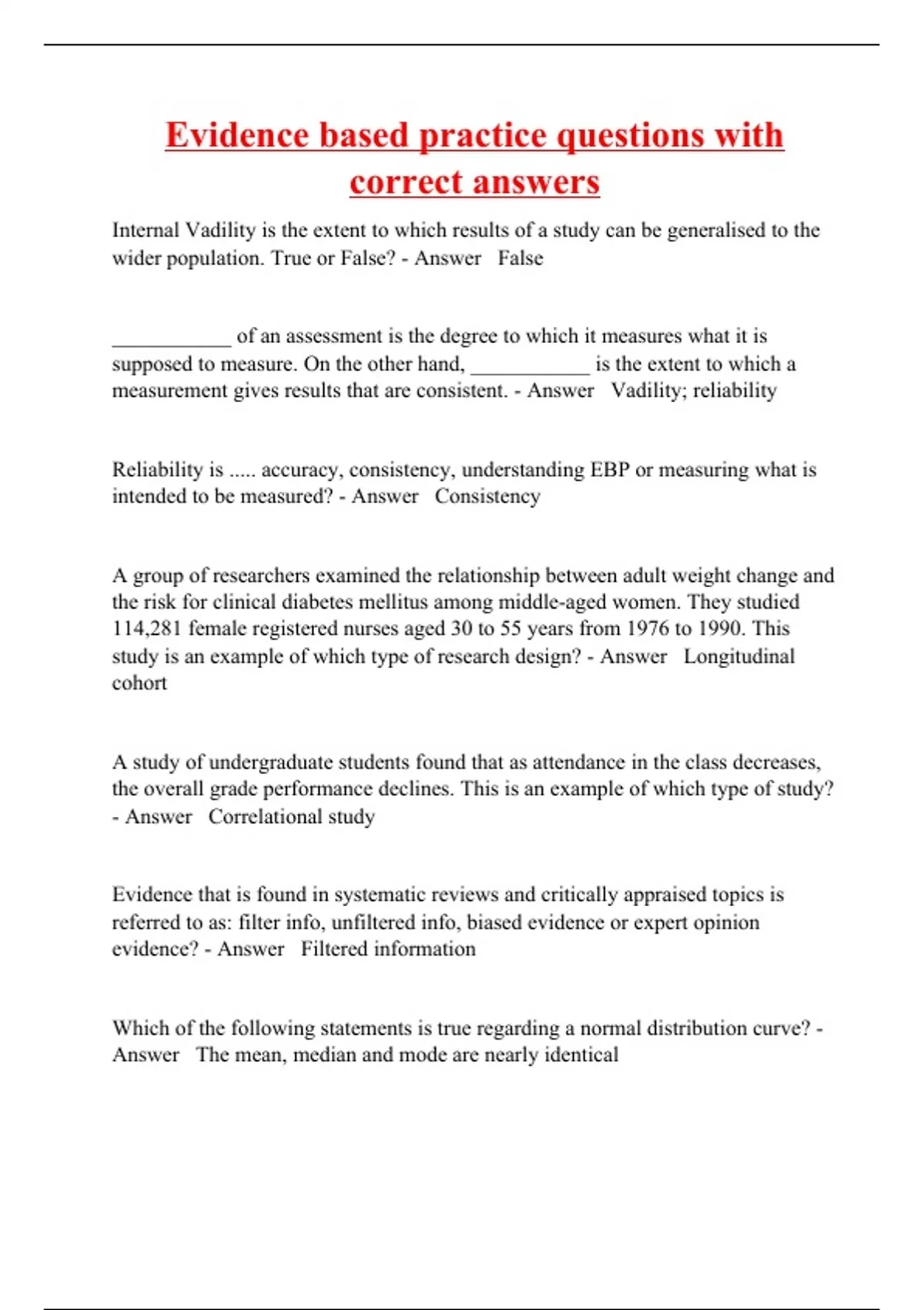 Internal Vadility is the extent to which results of a study can be generalised to the wider population. True or False? - Answer False ___________ of an assessment is the degree to which it measures what it is supposed to measure. On the other hand, ___________ is the extent to which a measurement gives results that are consistent. - Answer Vadility; reliability Reliability is ..... accuracy, consistency, understanding EBP or measuring what is intended to be measured? - Answer Consistency A group of researchers examined the relationship between adult weight change and the risk for clinical diabetes mellitus among middle-aged women. They studied 114,281 female registered nurses aged 30 to 55 years from 1976 to 1990. This study is an example of which type of research design? - Answer Longitudinal cohort A study of undergraduate students found that as attendance in the class decreases, the overall grade performance declines. This is an example of which type of study? - Answer Correlational study Evidence that is found in systematic reviews and critically appraised topics is referred to as: filter info, unfiltered info, biased evidence or expert opinion evidence? - Answer Filtered information Which of the following statements is true regarding a normal distribution curve? - Answer The mean, median and mode are nearly identical The number in a distribution that is vulnerable to the influence of extreme values
