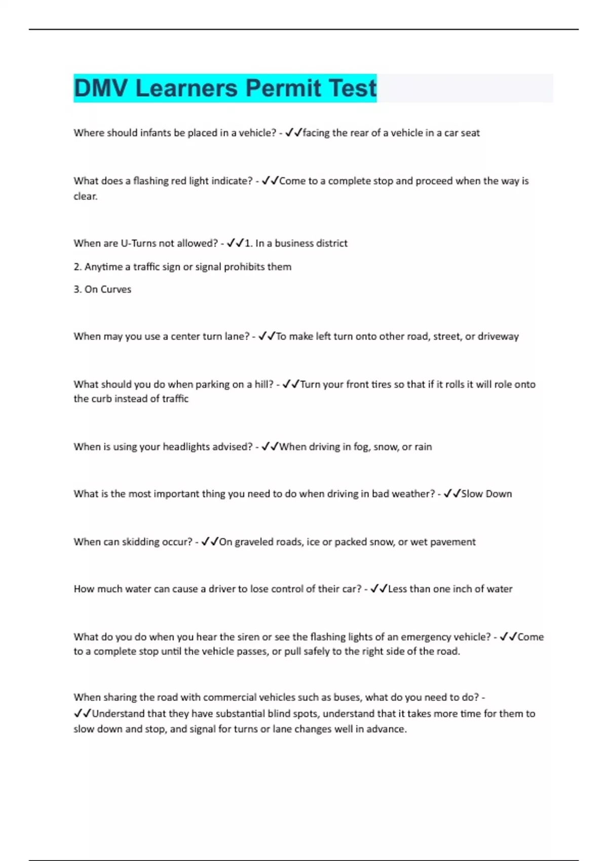 Where should infants be placed in a vehicle? - facing the rear of a vehicle in a car seat What does a flashing red light indicate? - Come to a complete stop and proceed when the way is clear. When are U-Turns not allowed? - 1. In a business district 2. Anytime a traffic sign or signal prohibits them 3. On Curves When may you use a center turn lane? - To make left turn onto other road, street, or driveway What should you do when parking on a hill? - Turn your front tires so that if it rolls it will role onto the curb instead of traffic When is using your headlights advised? - When driving in fog, snow, or rain What is the most important thing you need to do when driving in bad weather? - Slow Down When can skidding occur? - On graveled roads, ice or packed snow, or wet pavement How much water can cause a driver to lose control of their car? - Less than one inch of water What do you do when you hear the siren or see the flashing lights of an emergency vehicle? - Come to a complete stop until the vehicle passes, or pull safely to the right side of the road. When sharing the road with commercial vehicles such as buses, what do you need to do? - Understand that they have substantial blind spots, understand that it takes more time for them to slow down and stop, and signal for turns or lane chang