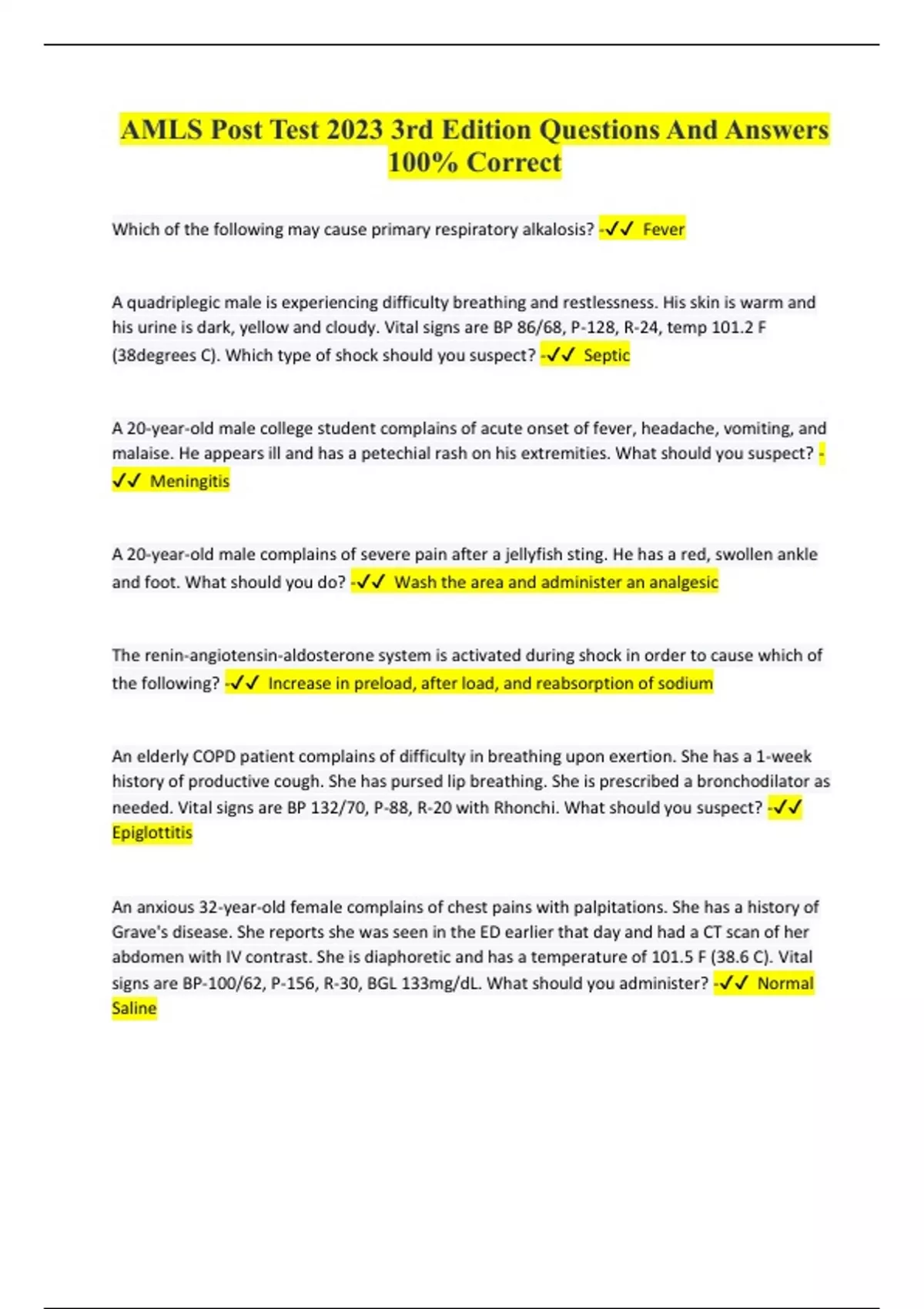 AMLS Post Test 2023 3rd Edition Questions And Answers 100% Correct Which of the following may cause primary respiratory alkalosis? - Fever A quadriplegic male is experiencing difficulty breathing and restlessness. His skin is warm and his urine is dark, yellow and cloudy. Vital signs are BP 86/68, P-128, R-24, temp 101.2 F (38degrees C). Which type of shock should you suspect? - Septic A 20-year-old male college student complains of acute onset of fever, headache, vomiting, and malaise. He appears ill and has a petechial rash on his extremities. What should you suspect? - Meningitis A 20-year-old male complains of severe pain after a jellyfish sting. He has a red, swollen ankle and foot. What should you do? - Wash the area and administer an analgesic The renin-angiotensin-aldosterone system is activated during shock in order to cause which of the following? - Increase in preload, after load, and reabsorption of sodium An elderly COPD patient complains of difficulty in breathing upon exertion. She has a 1-week history of productive cough. She has pursed lip breathing. She is prescribed a bronchodilator as needed. Vital signs are BP 132/70, P-88, R-20 with Rhonchi. What should you suspect? - Epiglottitis An anxious 32-year-old female complains of chest pains with palpitations. She has a history of Grave's disease. She reports she was seen in the ED earlier that day and had a CT scan of her abdomen with IV contrast. She is diaphoretic and has a temperature of 101.5 F (38.6 C). Vital signs are BP-100/62, P-156, R-30, BGL 133mg/dL. What should you administer? - Normal Saline What statement is correct regarding responding to a suspected nerve agent exposure? - Patients should be treated in a well-ventilated area What reference is the MOST beneficial to obtain for a suspected stroke? - Last Known Well Which of the following statements is correct regarding radioactive materials? - Simple clothing can stop beta particles from entering the body What finding is unique to pericarditis? - Diffuse ST segment elevation A 21-year-old male complains of sharp chest pain and shortness of breath. The symptoms started when he lifted a heavy object. Vital signs are BP-152/96, P-108, R-24 and diminished on the left. What should you suspect? - Spontaneous Pneumothorax A 72-year-old female complains of a sudden onset of a burning sensation to the left side of her forehead and blurred vision. She wants to follow up with her primary care physician tomorrow. Vital signs are BP-150/70, P-80, R-16. What should you do? - Encourage her to be transported by ambulance to the hospital An anxious 61-year-old male complains of severe shortness of breath and localized chest pain with blood-tinged sputum. His dyspnea started when he stood up from watching television all day and increased in severity as he moved around. Vital signs are BP-104/60, P-98 and irregular, R-26 and labored. What should you suspect? - Pulmonary Embolism Anaphylaxis is most commonly associated with which physiological event? - Vasodilation A confused 67-year-old male has vomited multiple times prior to EMS arrival. He was involved in a car crash 48 hours prior. Bystanders state he became increasingly confused and lost coordination since the crash. Vitals signs are BP-150/88, P-72, R-18, BGL-92 mg/dL. What should you suspect? - Subdural Hematoma